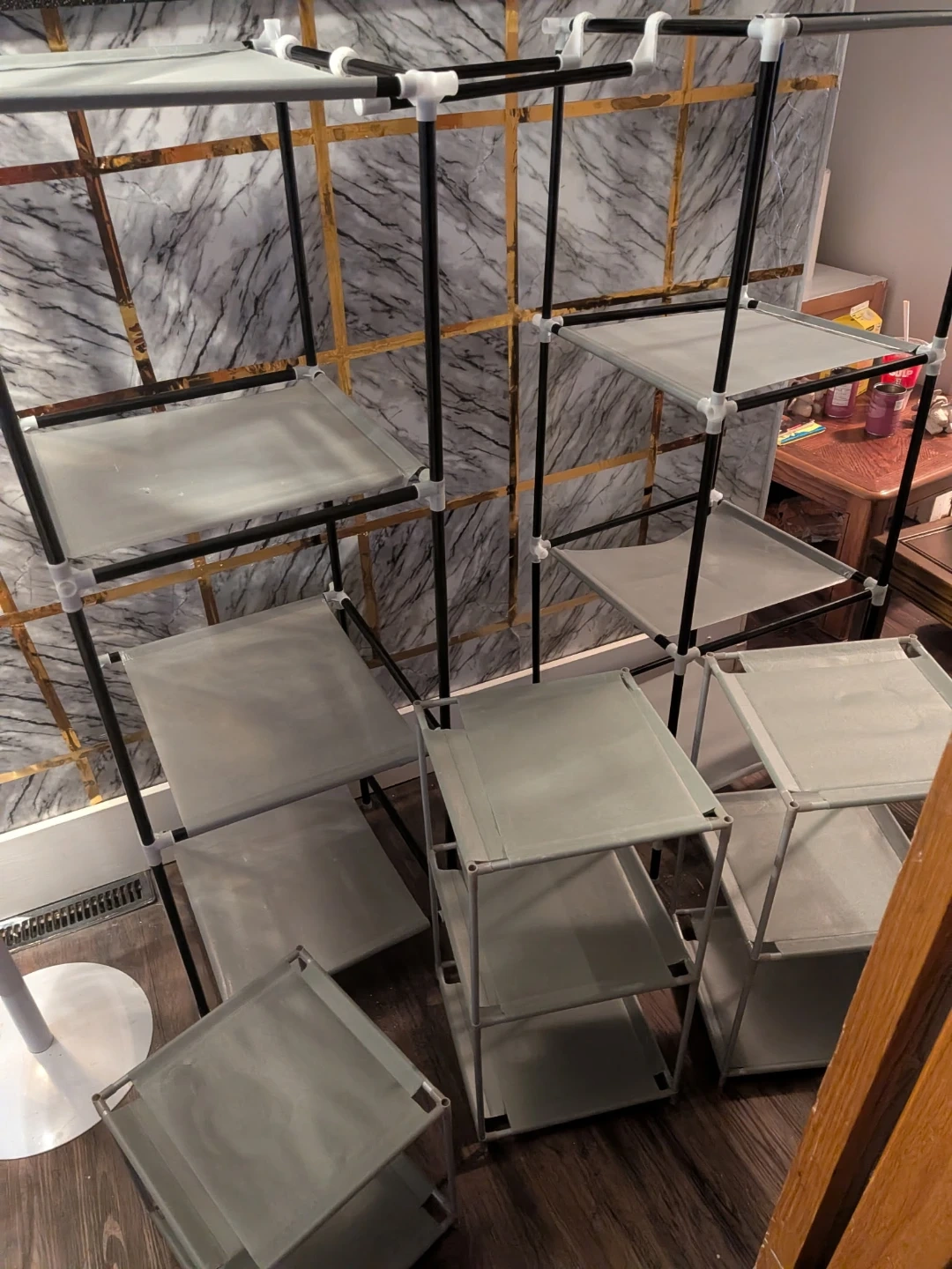 Grey fabric and metal frame portable shelving unit. It's great for organizing items in a closet or small space! Assembly requires. Fabric shelves.