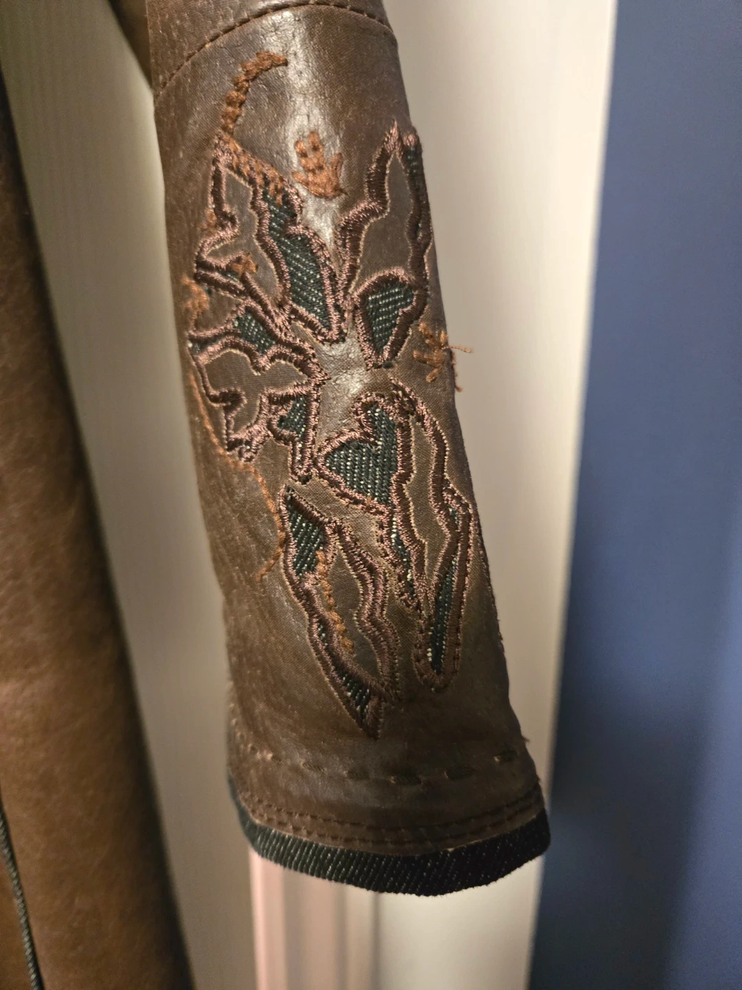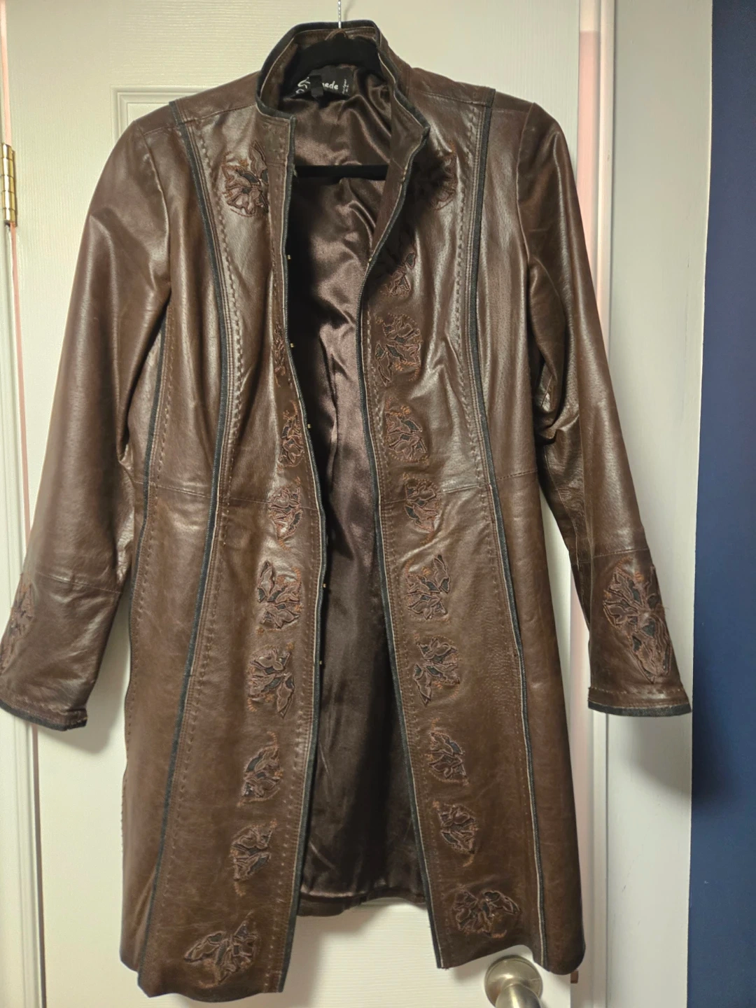 Selling a vintage stylish Suede by/par R.T. leather coat in size L. It's a beautiful brown colour with unique embroidered detailing. The coat is in great condition and ready for a new home!