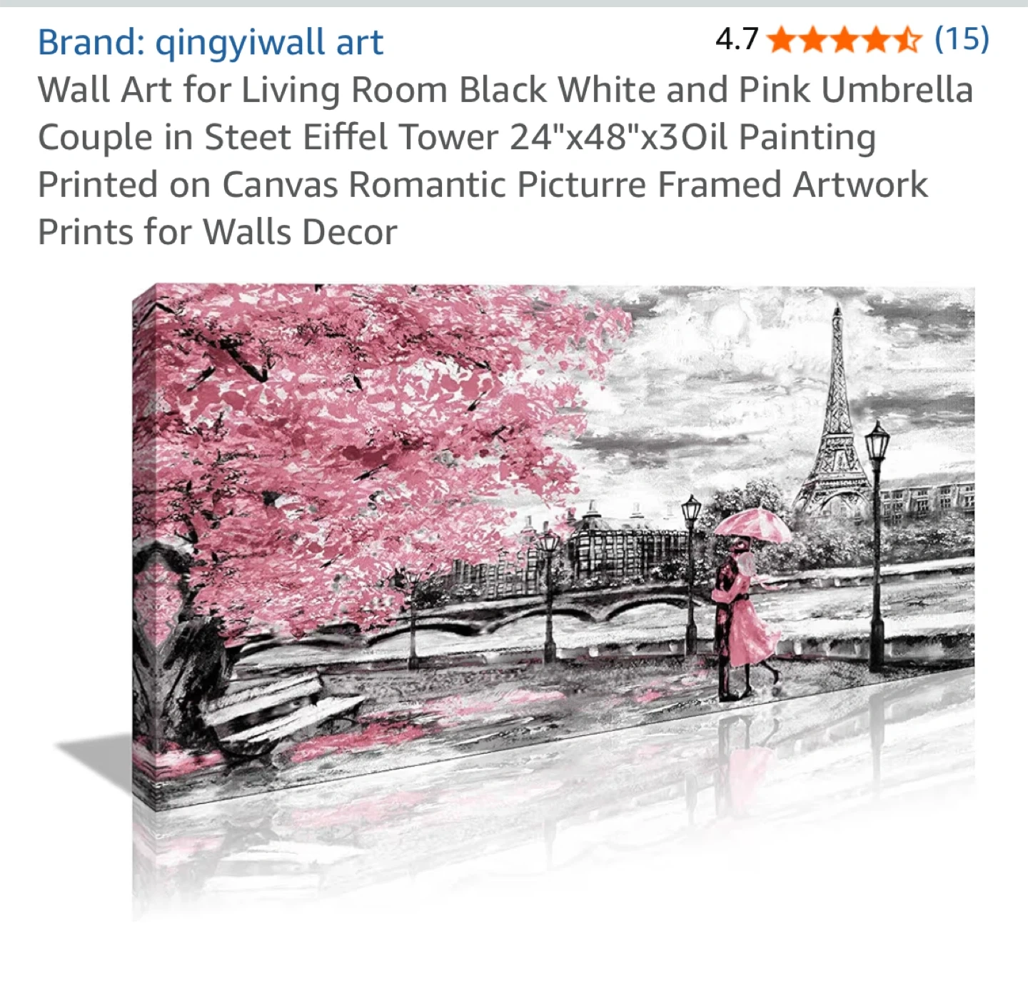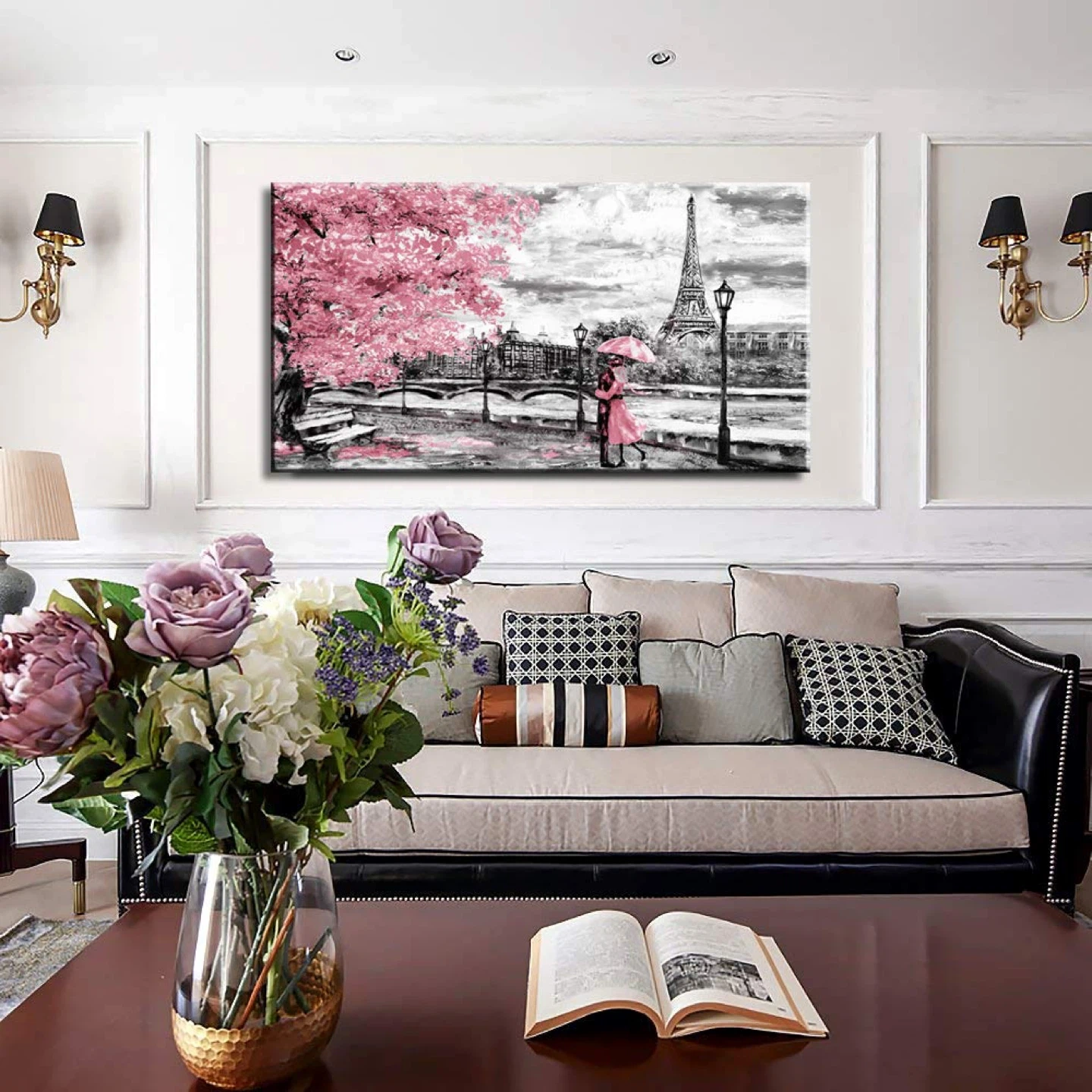 This is a Qingyiwall Art canvas print featuring a romantic scene with the Eiffel Tower. The print is black and white with a touch of pink, showing a couple with an umbrella. It's sized at 24 inches by 48 inches, and 3 inches thick. This beautiful piece is ready to hang and would look great in any living room, bedroom, or office!