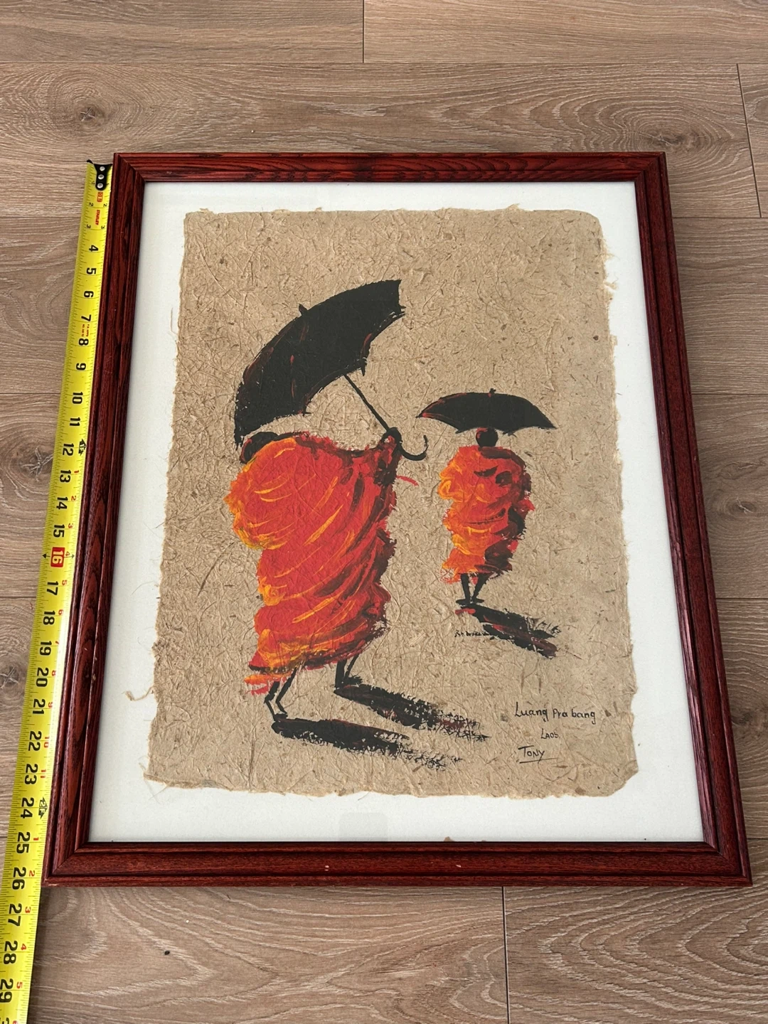 Hand-signed by Tony in the lower right corner and inscribed with “Luang Prabang, Laos,” this piece shows two monks in saffron robes under black umbrellas. The artwork is framed in a deep wood-grain finish with light wear consistent with age, professionally matted, and wired on the back for easy hanging. Ideal for a living room, office, or hallway, this painting brings a peaceful and culturally rich accent to any space.