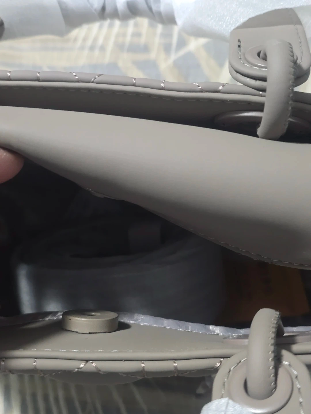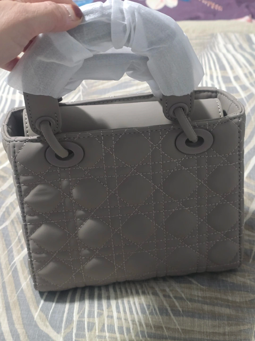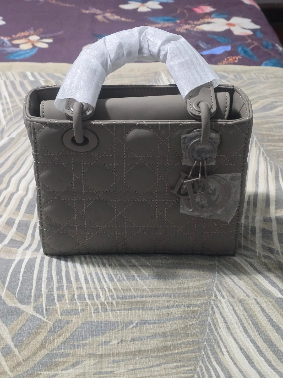 This is a grey quilted top handle handbag. It's made of faux leather and has a snap closure. The bag comes with a charm detail.
