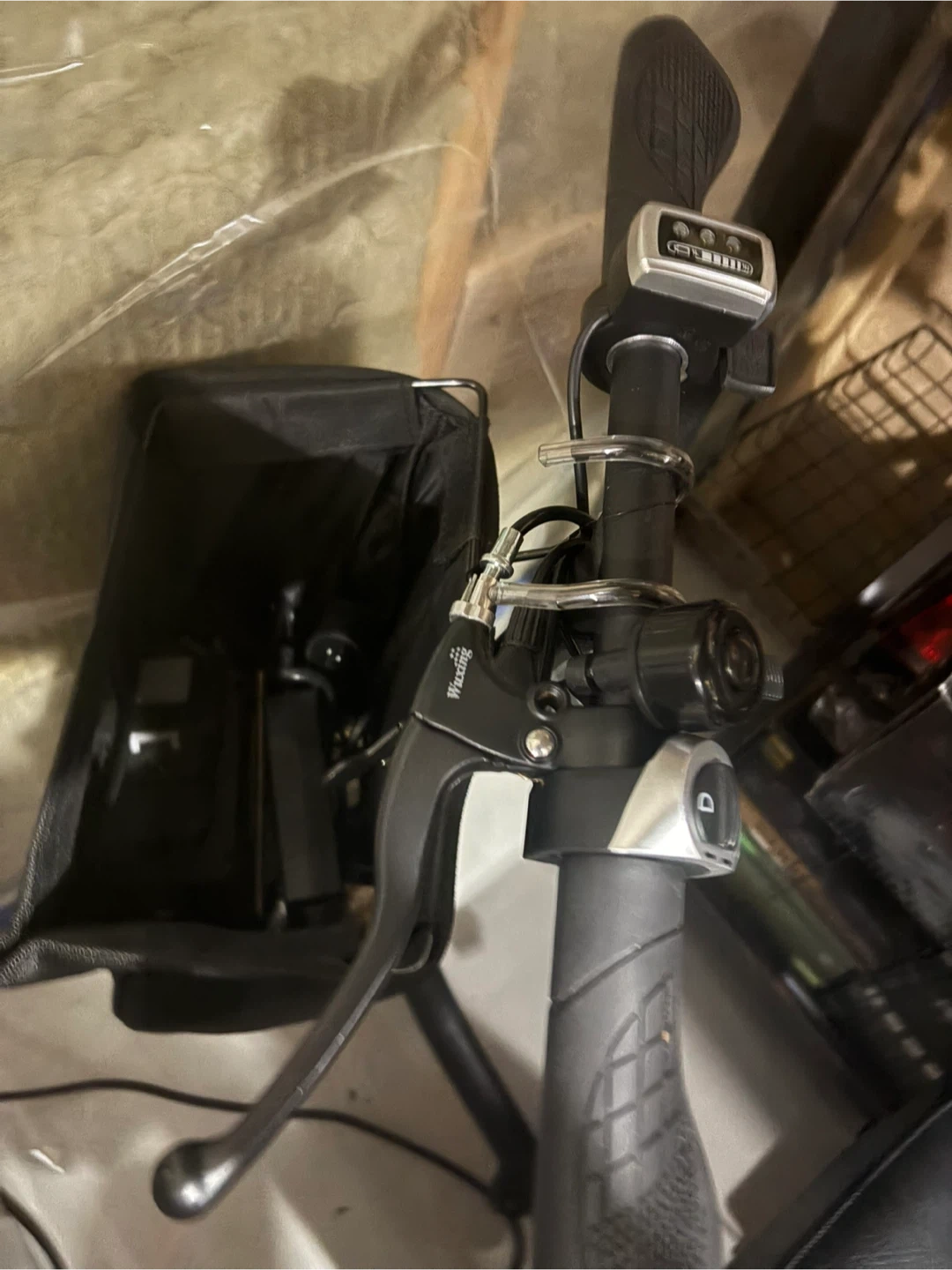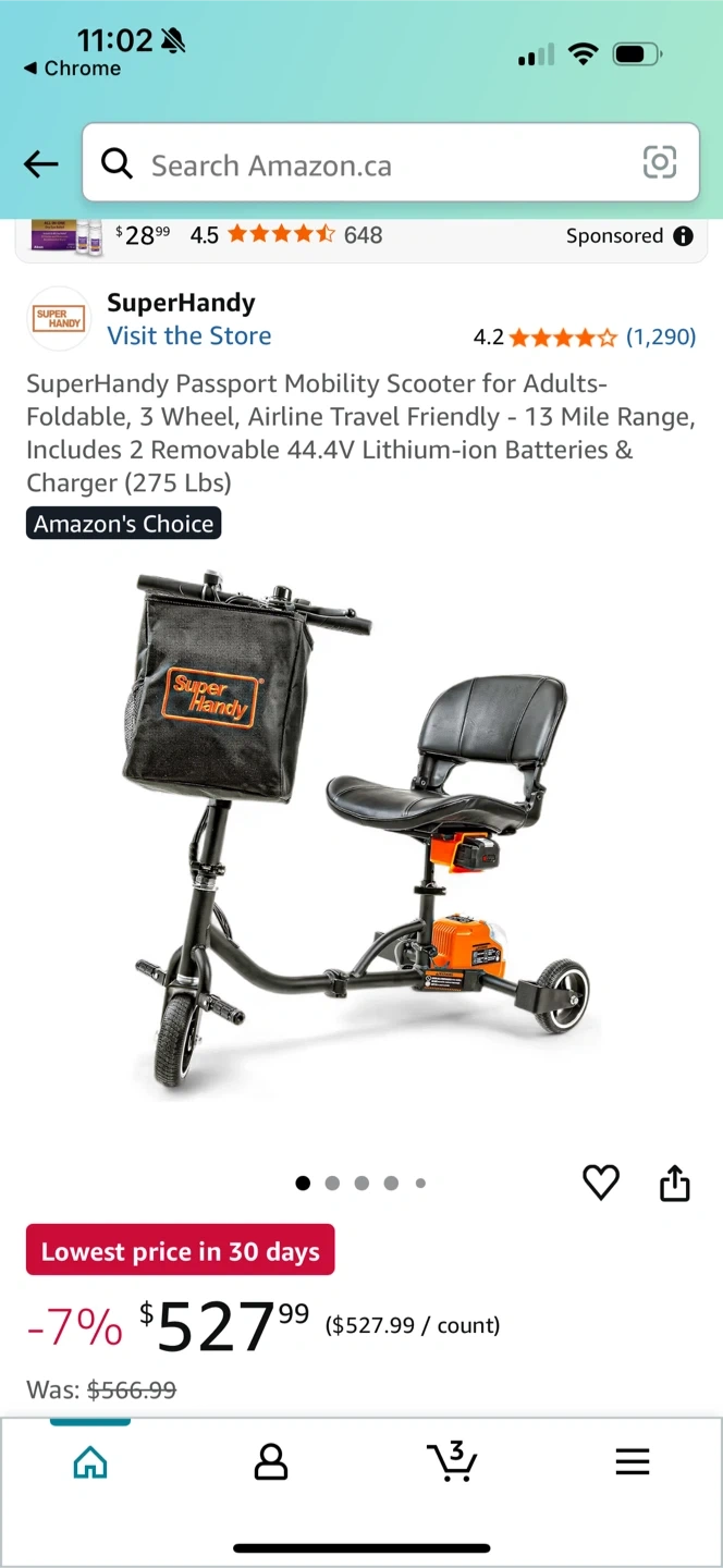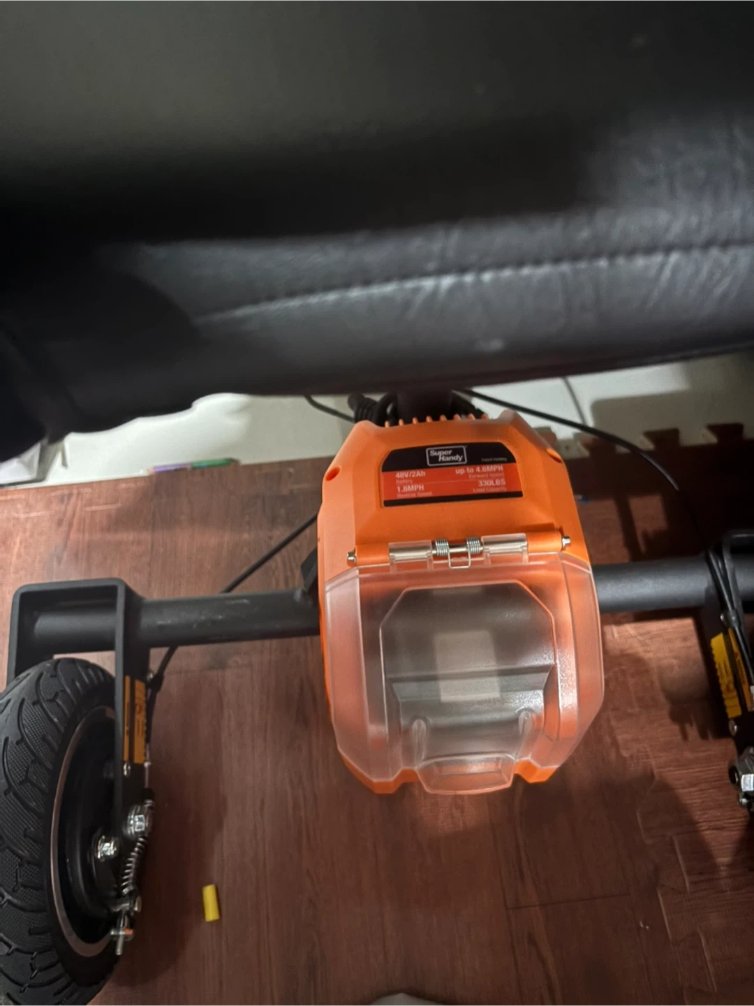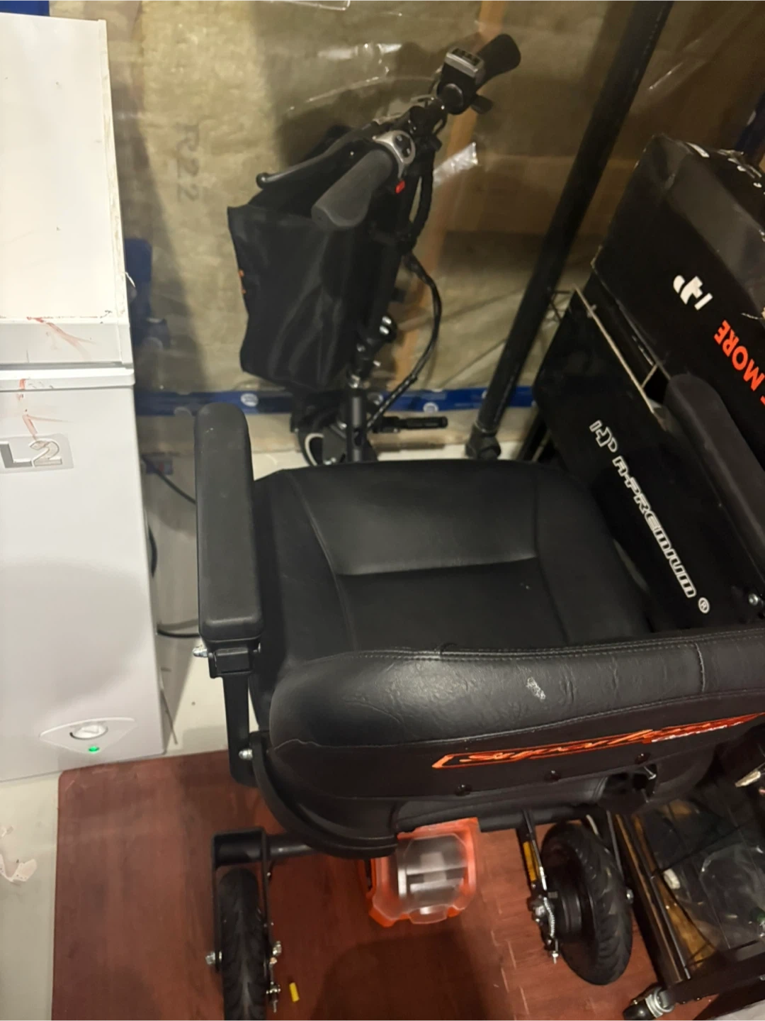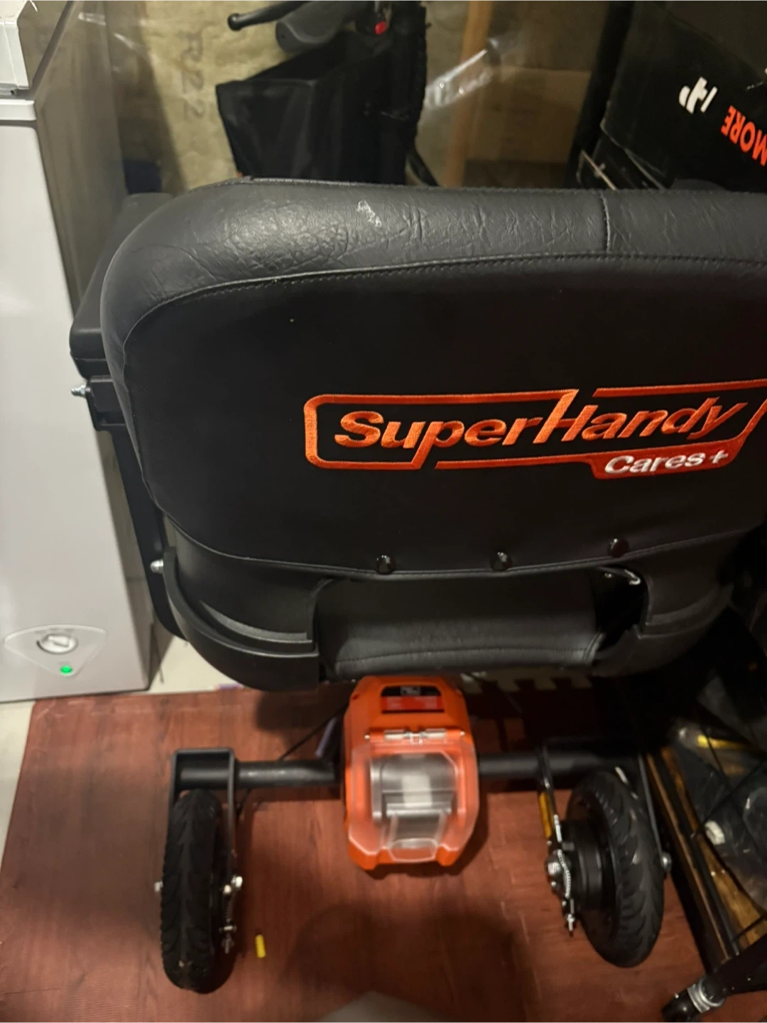 SuperHandy Cares+ mobility scooter. It's foldable and has a 13-mile range. Includes two removable 44.4V lithium-ion batteries and charger.
