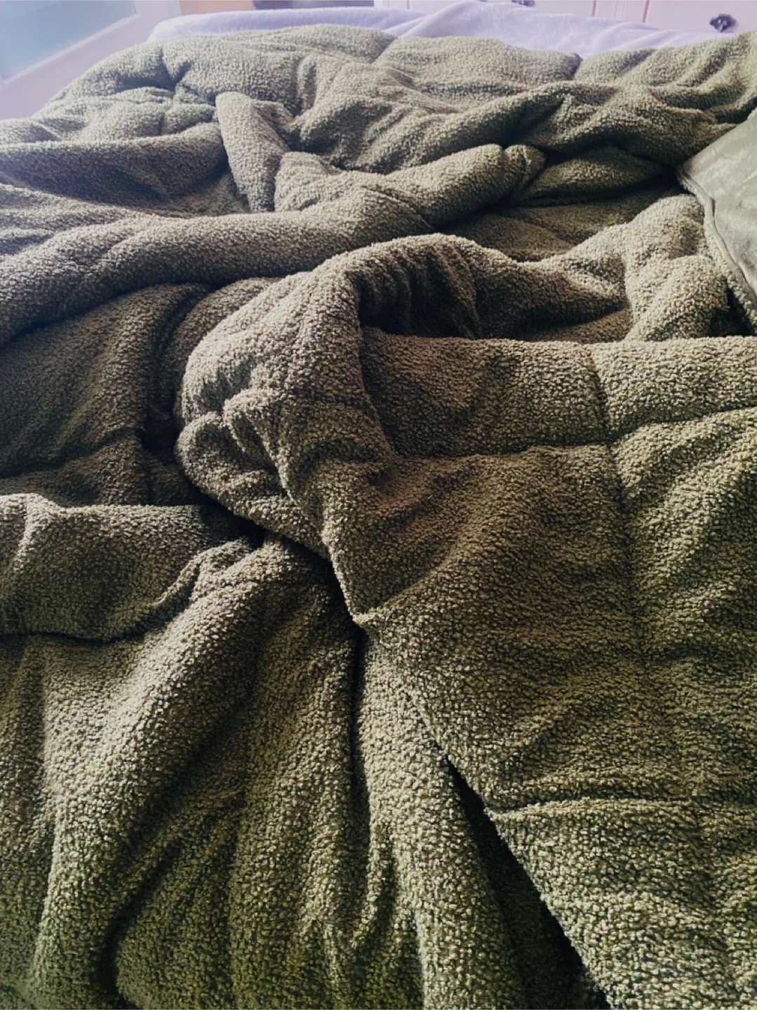 nice forest green queen size comforter and two pillow covers along with a black mattress cover. brand new jus didnt like the colour, mattress cover will be freshly washed the day before a pick up is planned. comforter is two sided, one texture is like a soft almost poodle like texture (hence the curly looking fabric on one side, it’s very soft) and the other is a soft velvet.