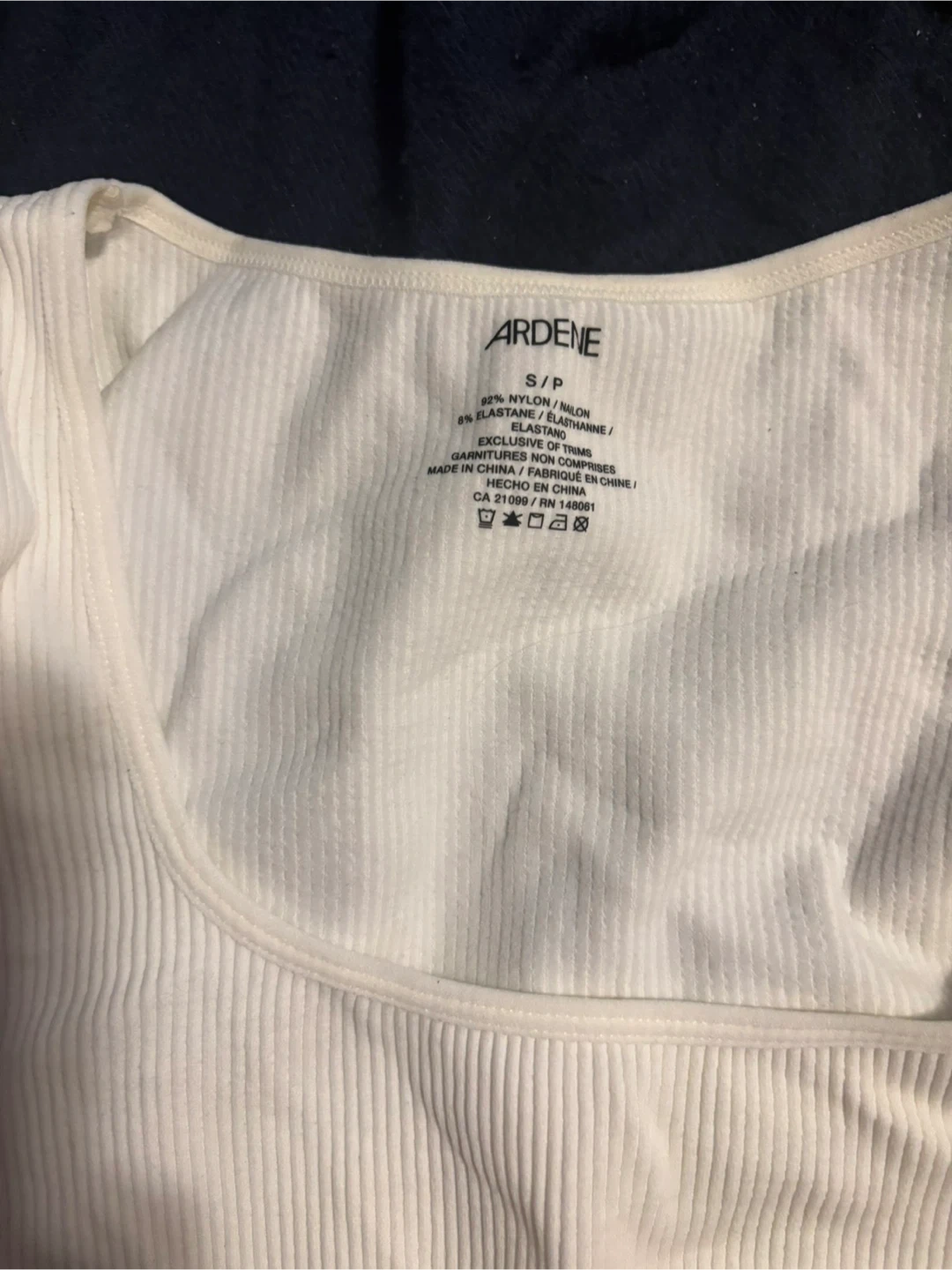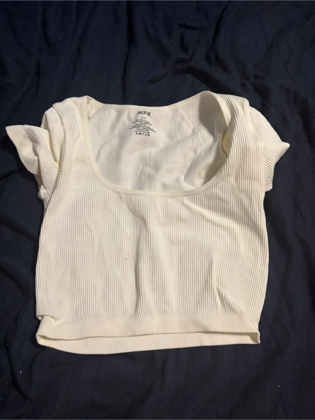 Selling a cute white ribbed top from Ardene! It's a size S/P and made of 92% nylon and 8% elastane. Perfect for a casual look!