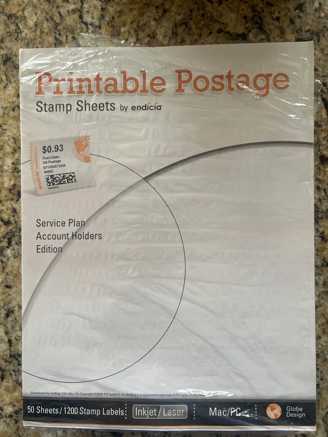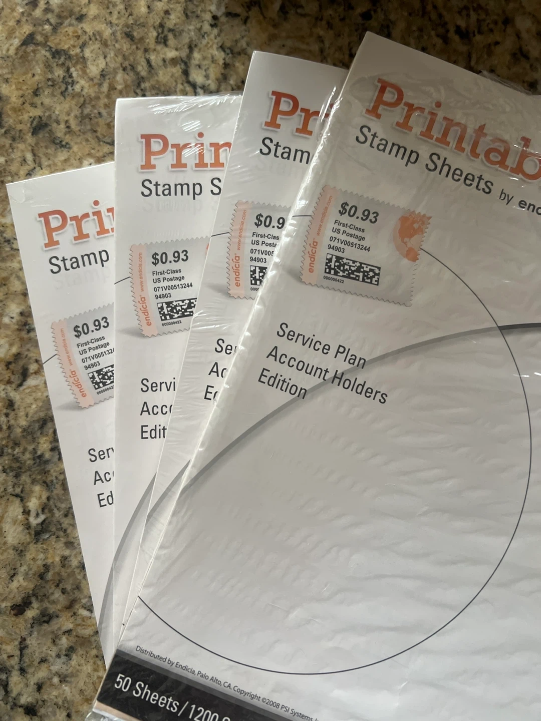 Four packs of Endicia Printable Postage Stamp Sheets, Service Plan Account Holders Edition. Each pack contains 50 sheets with 1200 stamp labels total. Designed for Inkjet/Laser printers.