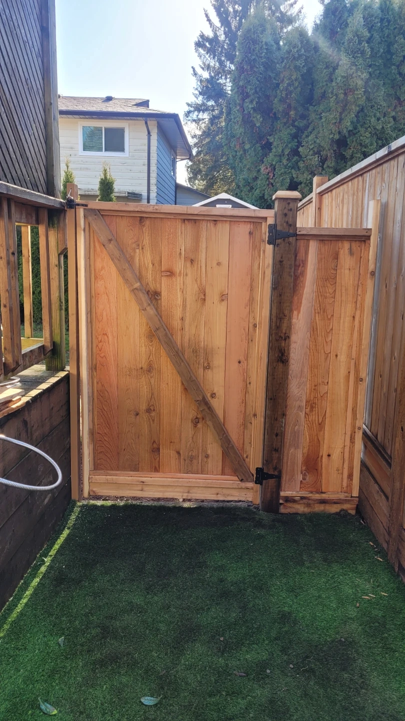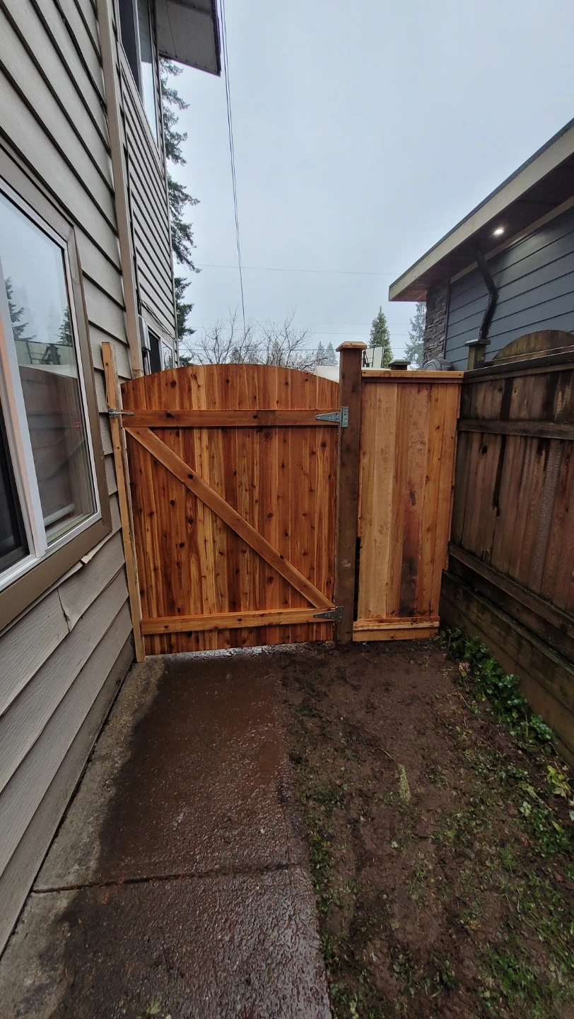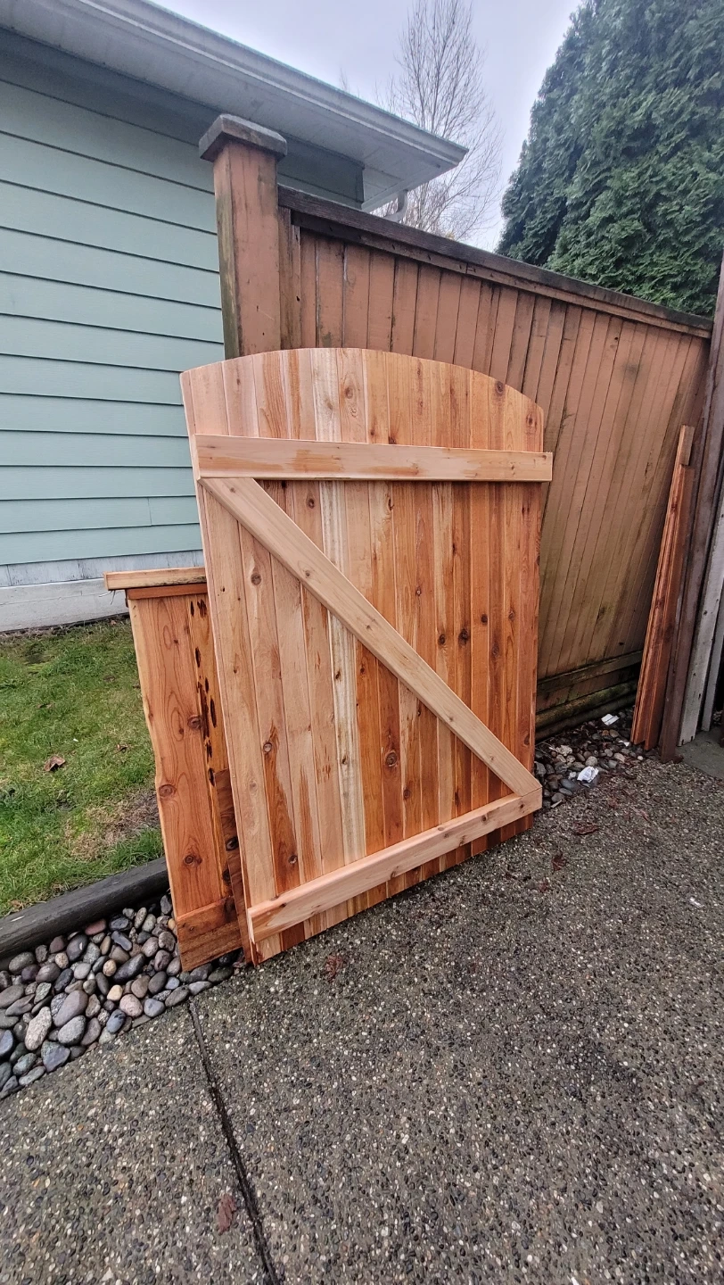 This is a sturdy wooden garden gate, constructed from cedar. It's perfect for adding privacy and security to your yard. Different styles, arch, spaced and square.