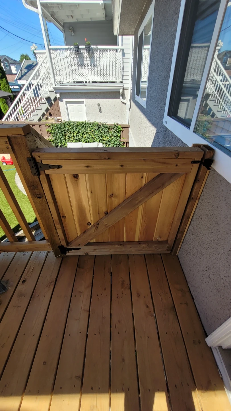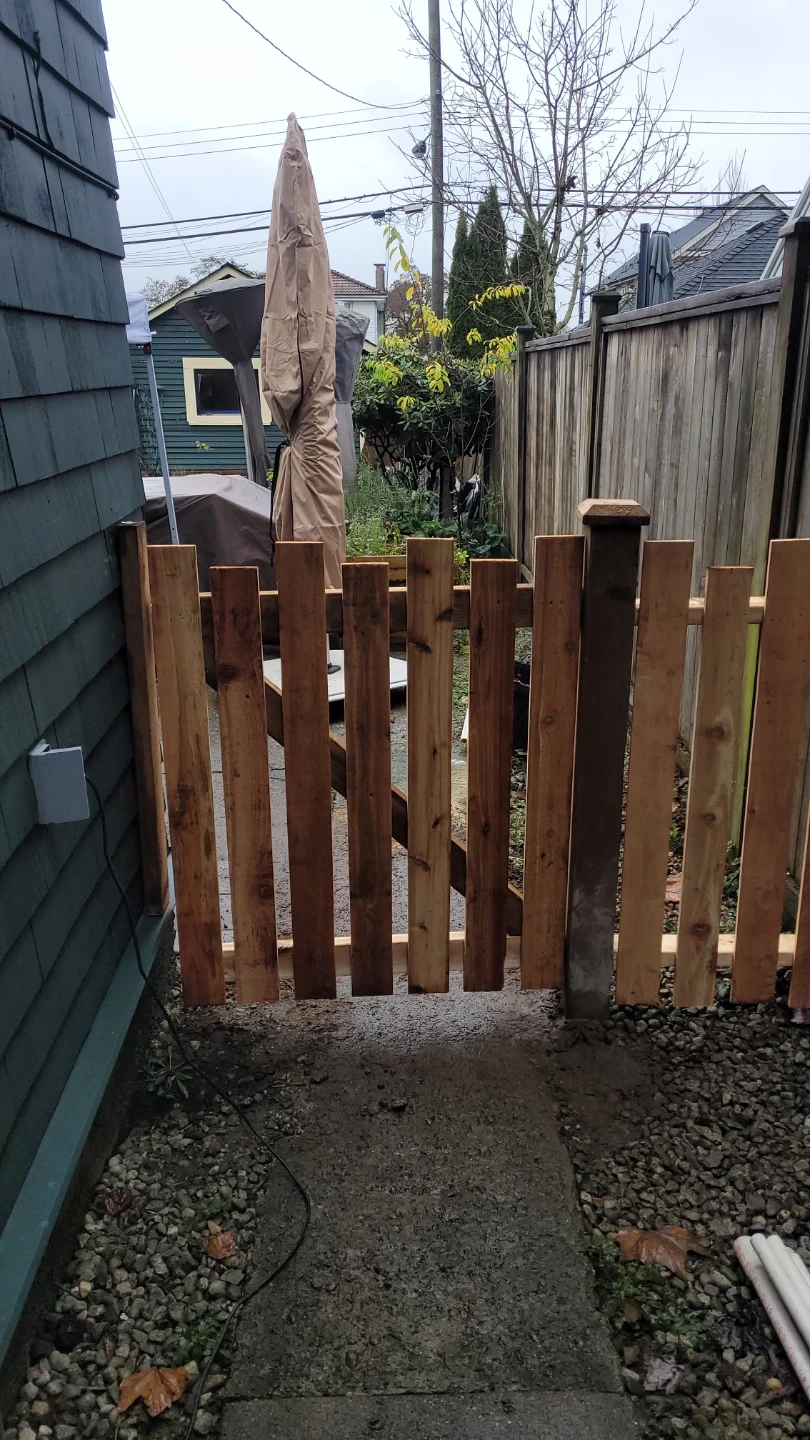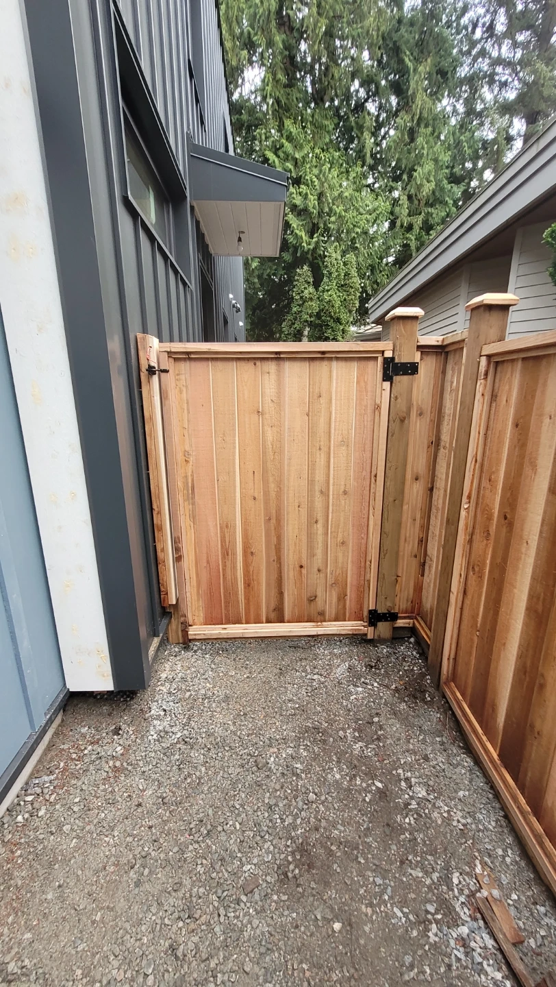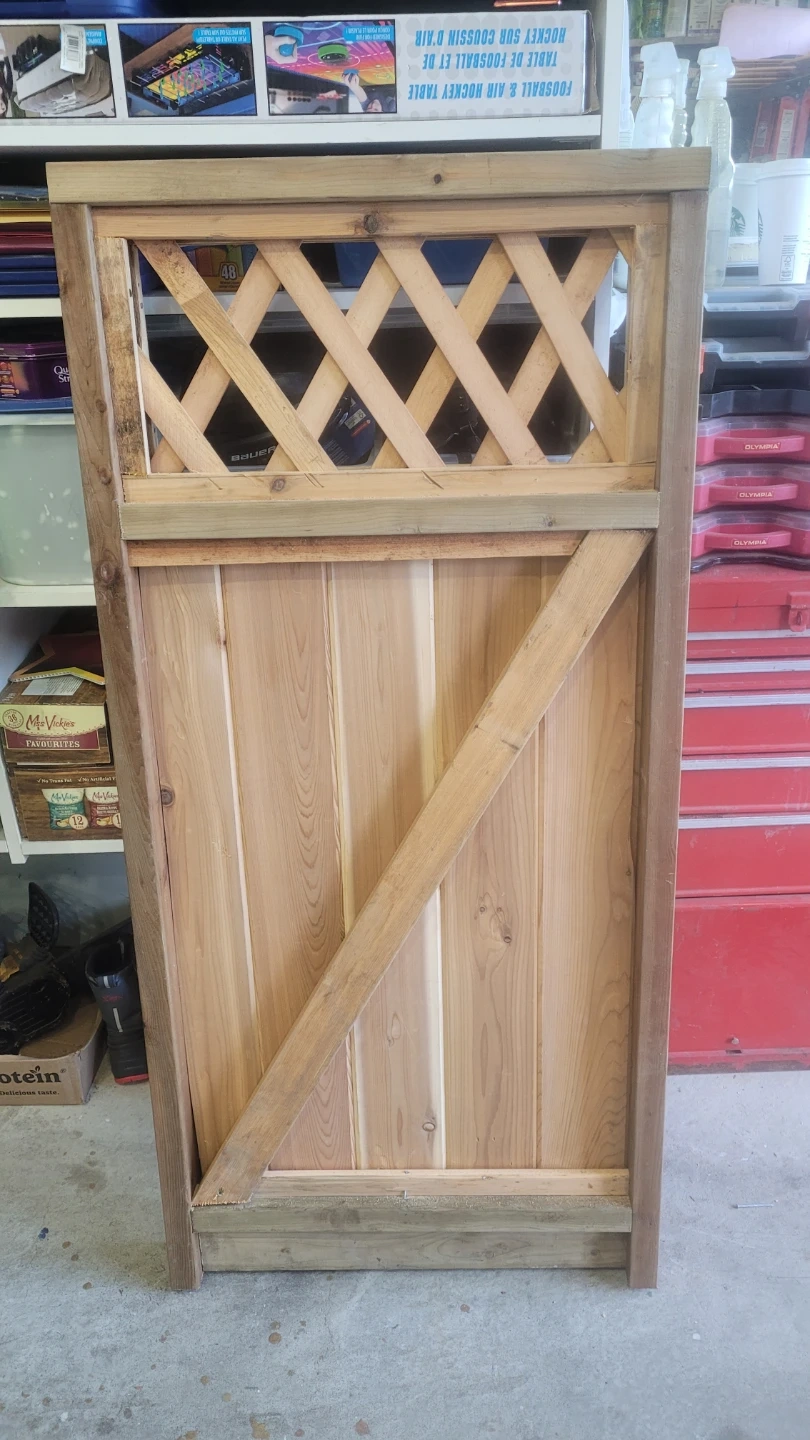 This is a sturdy wooden garden gate, constructed from cedar. It's perfect for adding privacy and security to your yard. Different styles, arch, spaced and square.