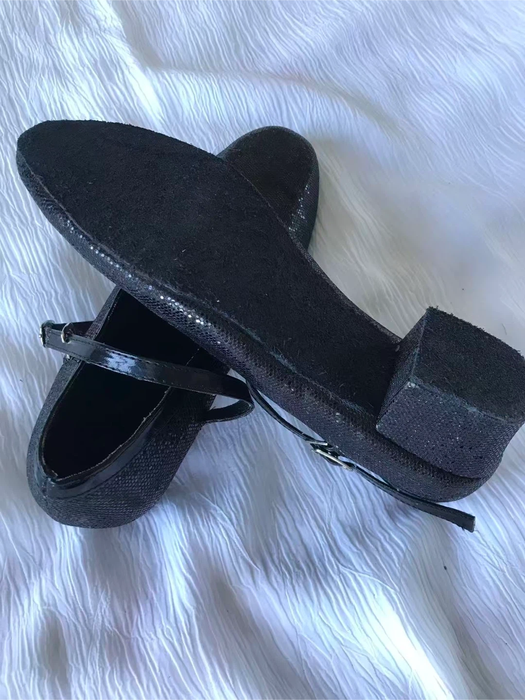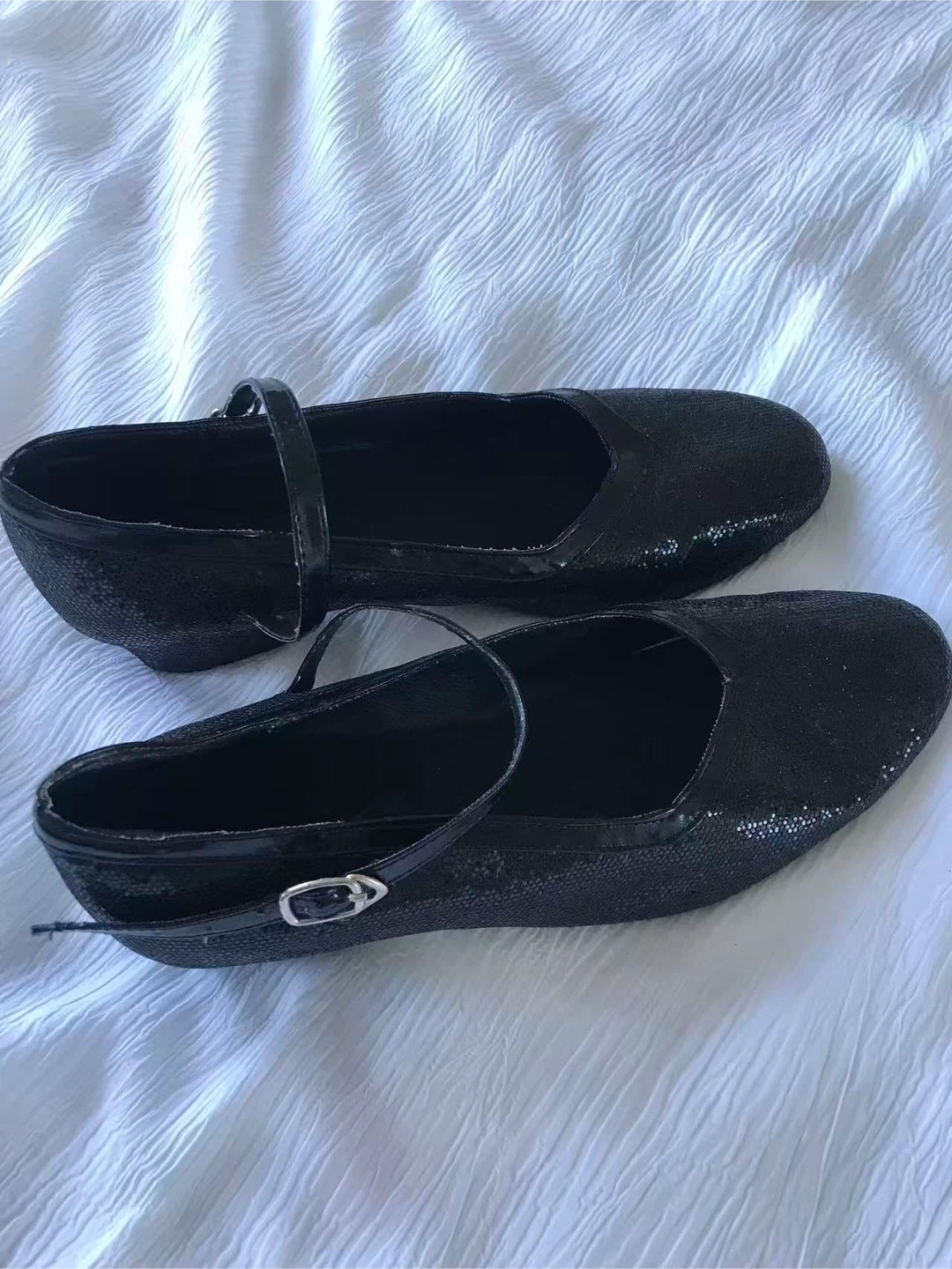 Black Mary Jane flats with a sparkly finish and adjustable ankle strap. These shoes have a small block heel and buckle closure. Perfect for dressing up any outfit and for ballroom dancing!