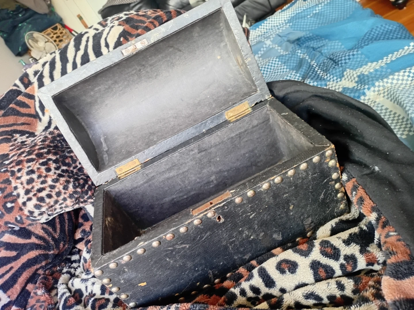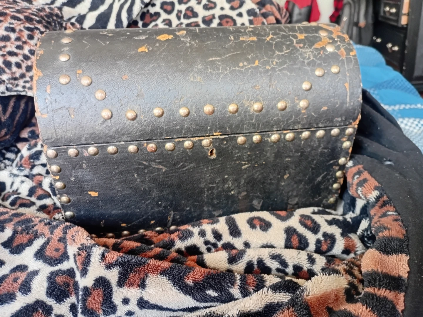 This is a black decorative trinket chest with metal stud accents. It's a hinged box with a latch. Antique had for about 50 years in family. It's suitable for storing small items. Needs a key pretty sure it can lock make an offer doesnt matter low or high. Used it for a jewlery box want to keep.