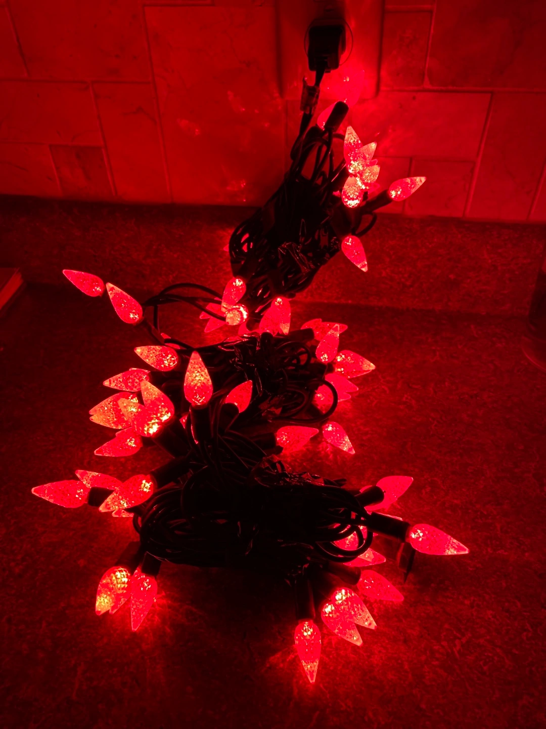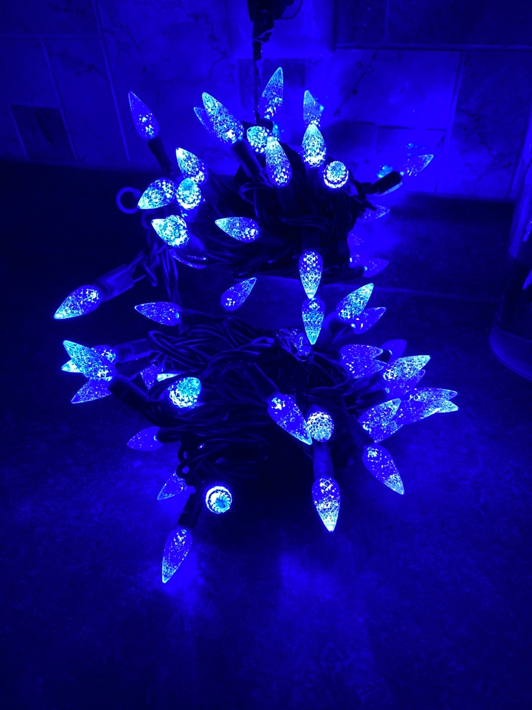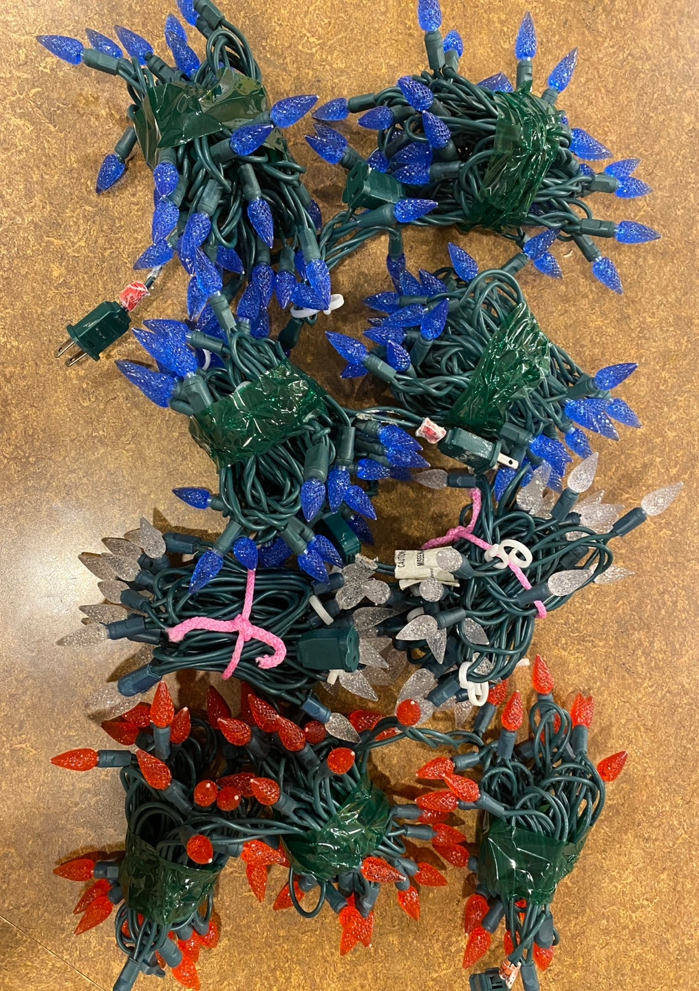 Set of 3 strands of Christmas lights. Two blue, one red and one white. Each strand has 70 lights and are in working condition.