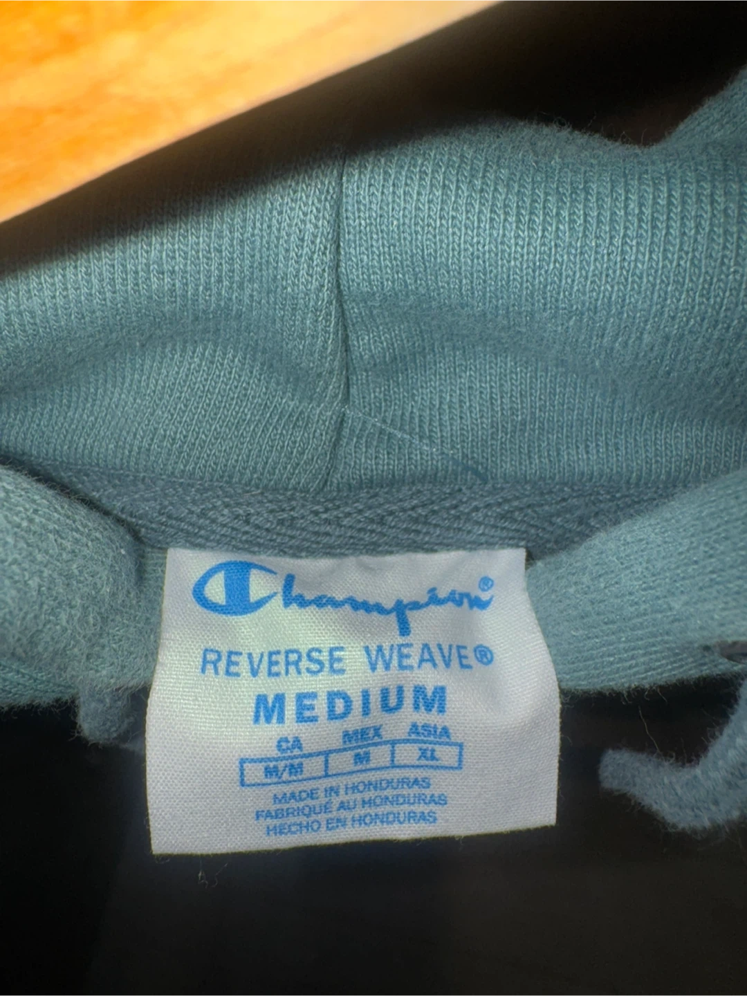 This is a Champion Reverse Weave hoodie in a medium size. It's made with a comfortable cotton blend and features the classic Champion logo on the chest.