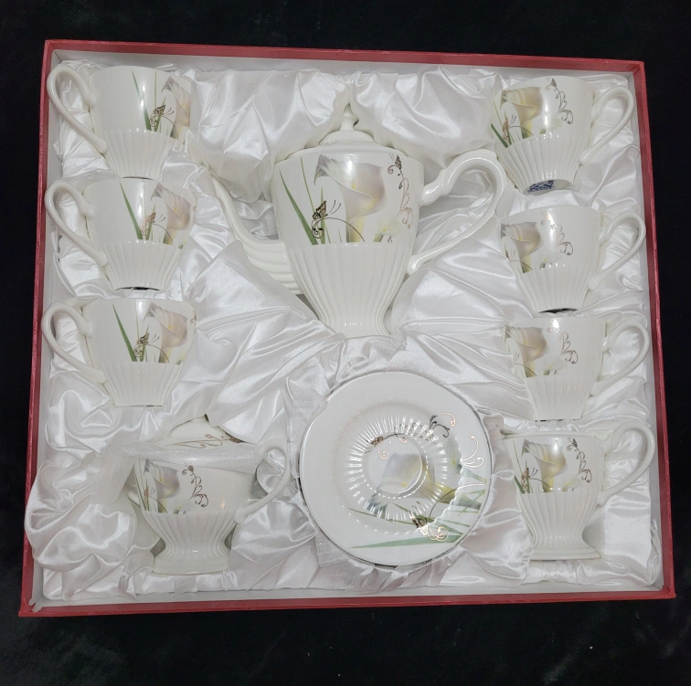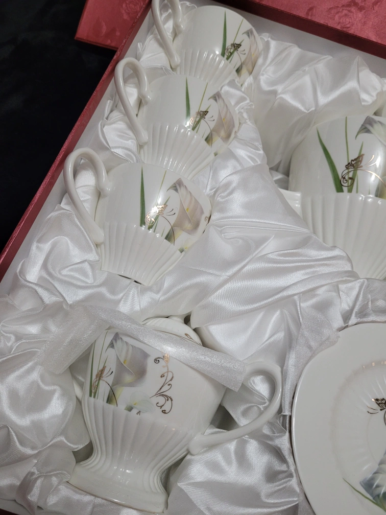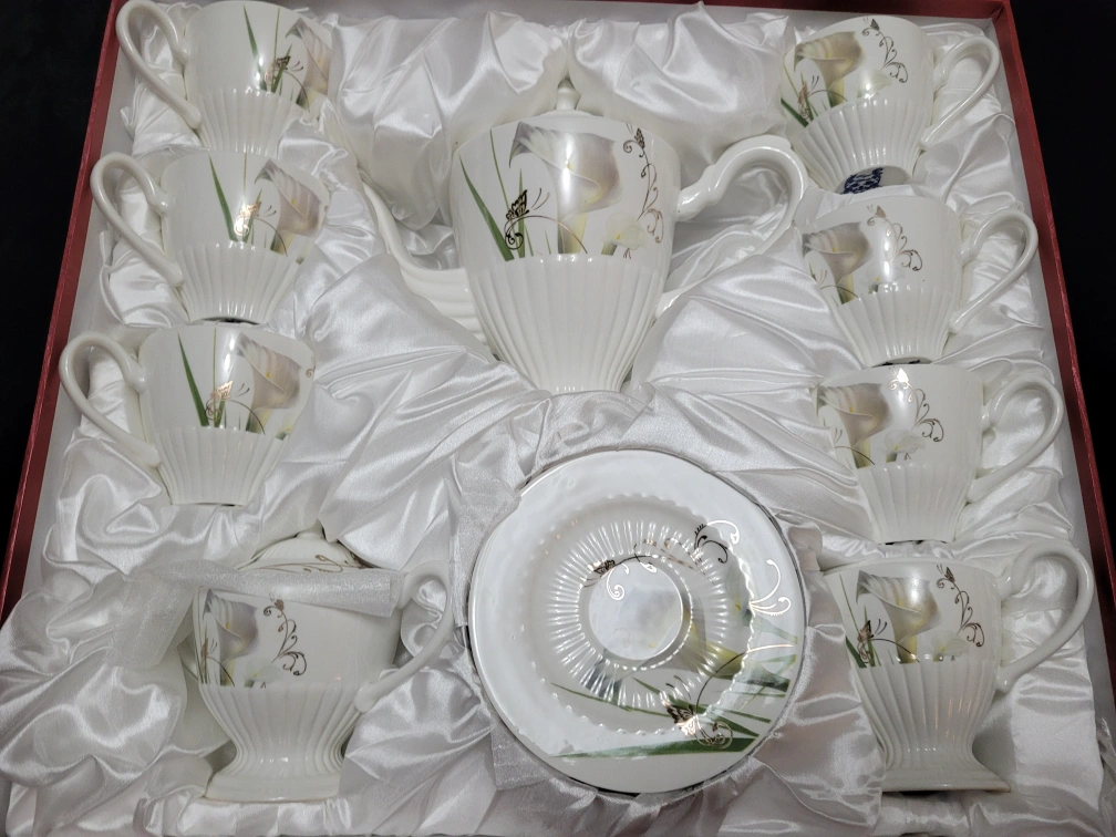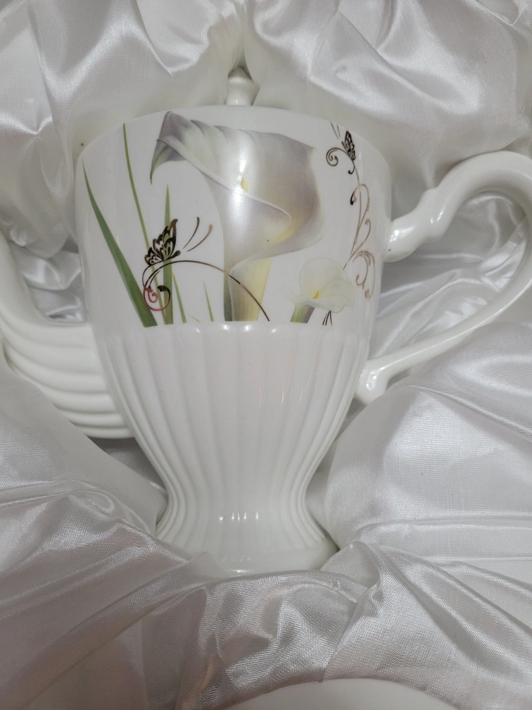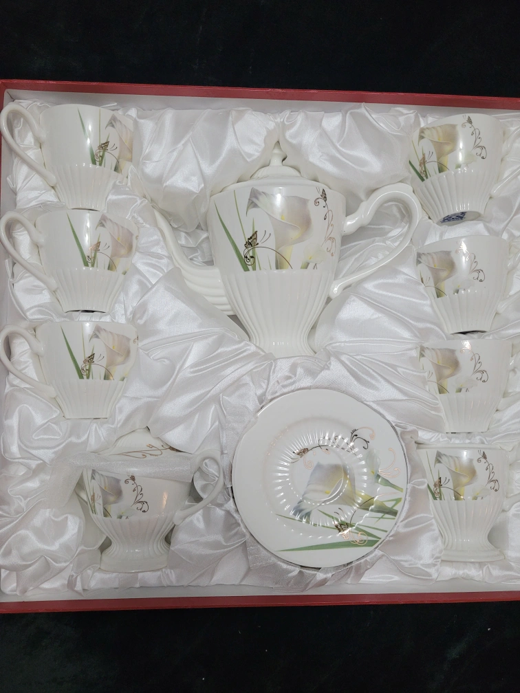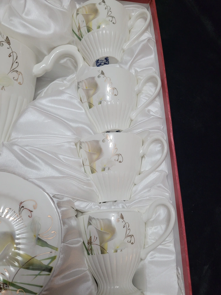Complete Fine Porcelain tea set includes cups, saucers, and a tea pot. Cups and tea pot feature a gorgeous floral design. Set is beautifully packaged in a red box, and has never been used.