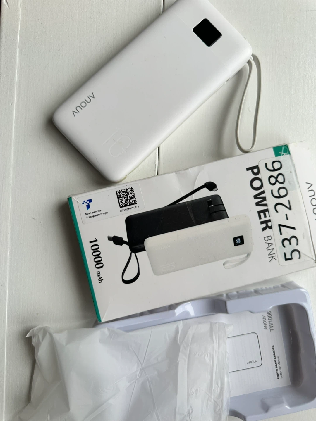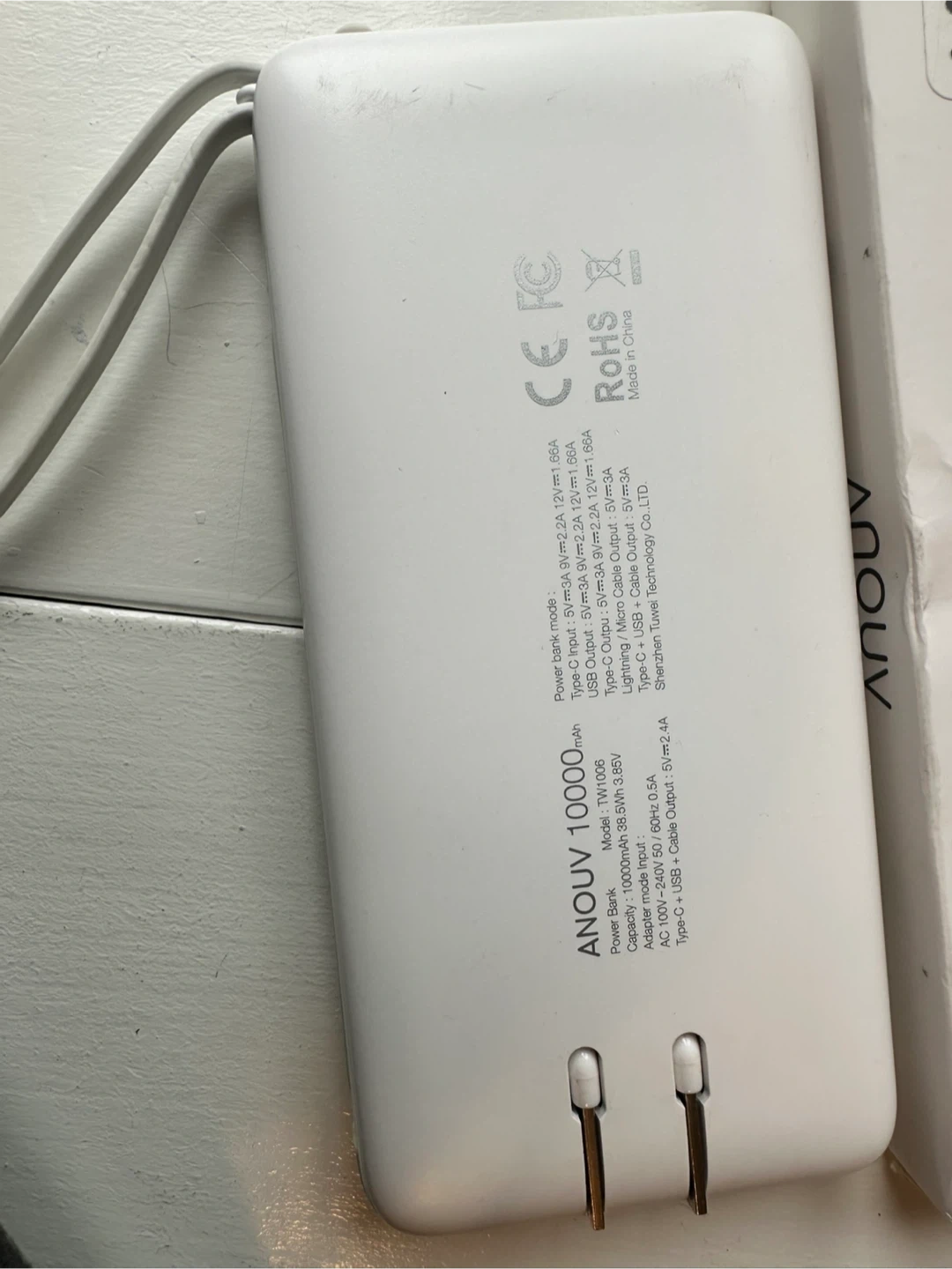 This is an ANOV 10000mAh power bank, model TW1006. It has a capacity of 38.5Wh (3.5A). The adapter mode input is AC 100V-240V 50/60Hz 0.5A. Input is 5V/2A, 9V/2A, 12V/1.5A. Type-C output is 5V/3A, 9V/2.2A, 12V/1.67A. USB output is 5V/3A, 5V/4.5A, 9V/2A, 12V/1.5A. Lightning/Micro-USB output is 5V/3A. Type-C + USB + Lightning input is 5V/2.4A.