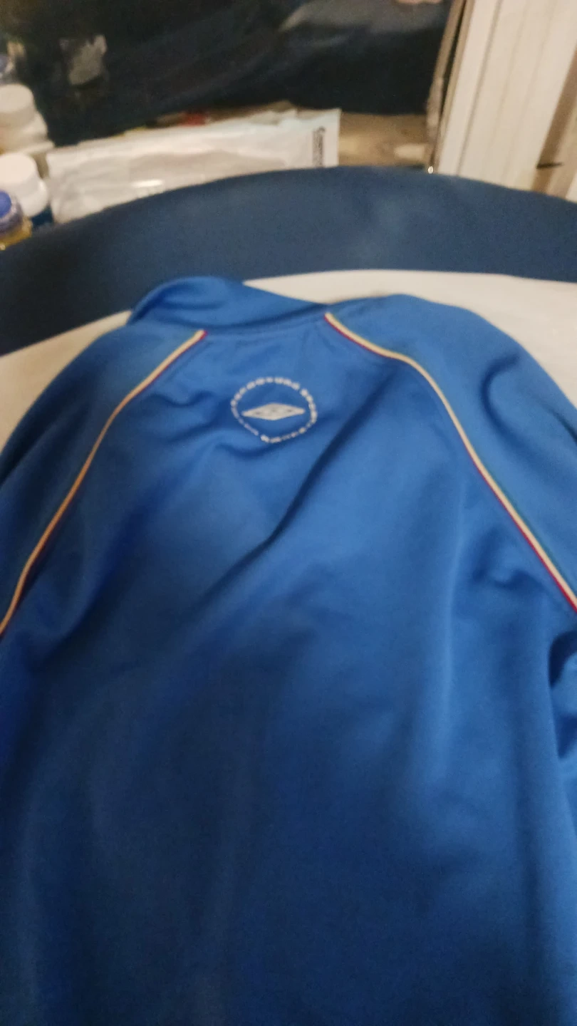 Blue Umbro track jacket with "ITALIA" text on the front. Features the Italian flag crest on the chest. Ribbed cuffs and hem with red, white, and green stripes. Some minor spots are visible on the front. Some marks on elbows!
