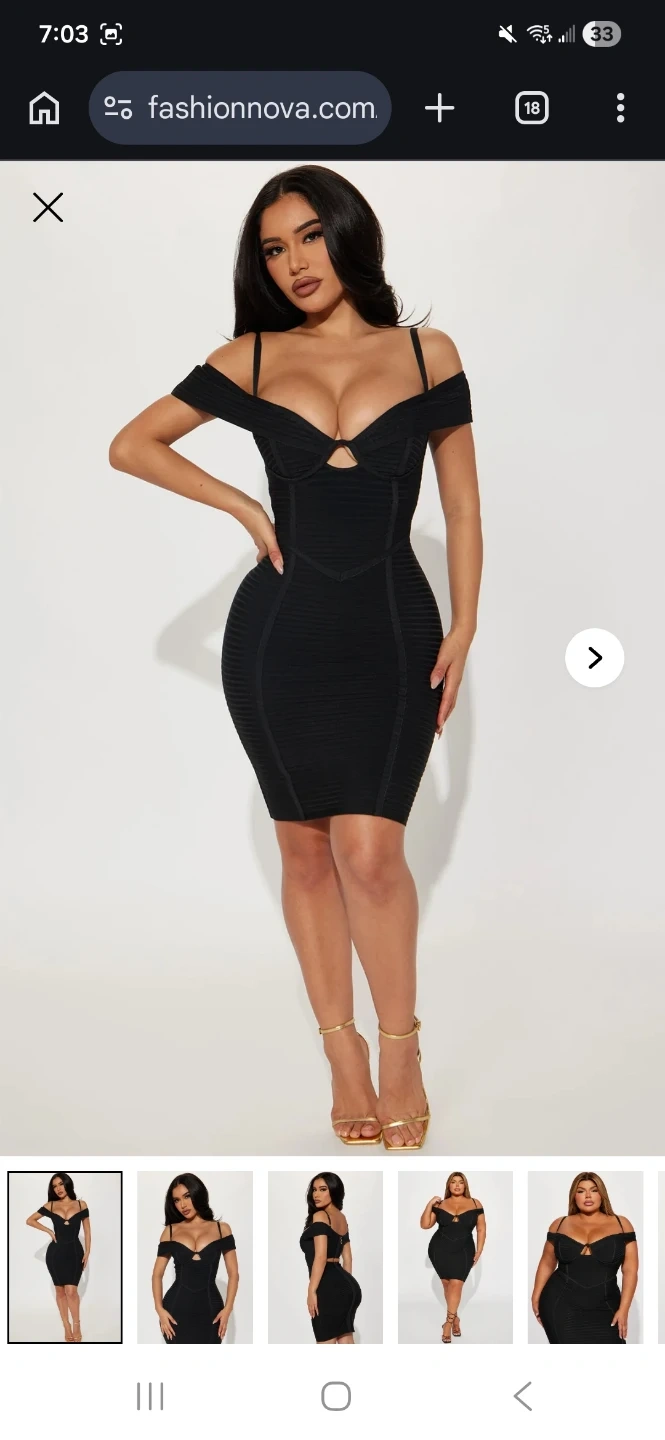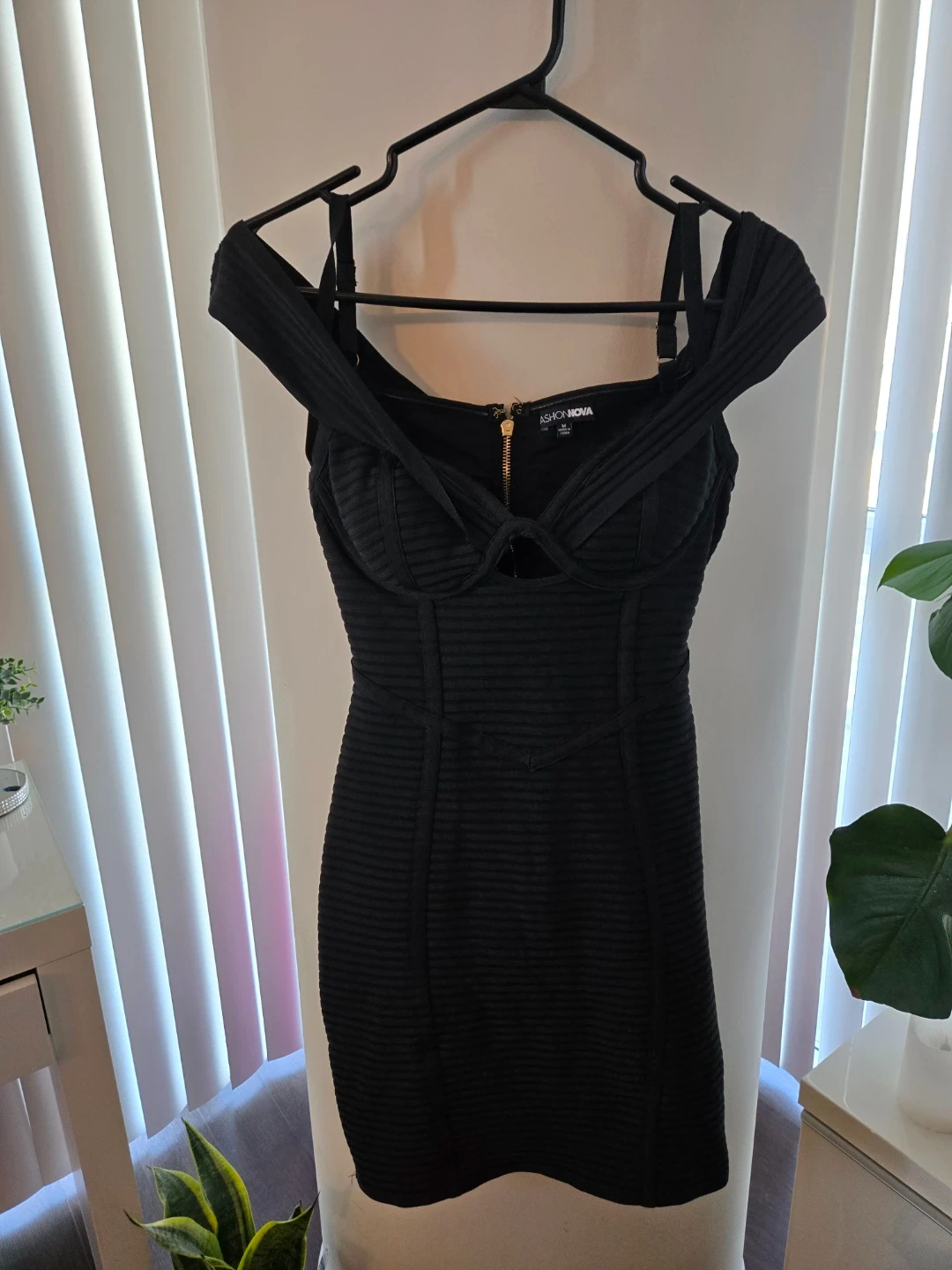 This black Fashion Nova dress features an off-the-shoulder design with a cutout detail at the bust. It's a bodycon style with a ribbed texture and a gold zipper closure at the back. Perfect for a night out!