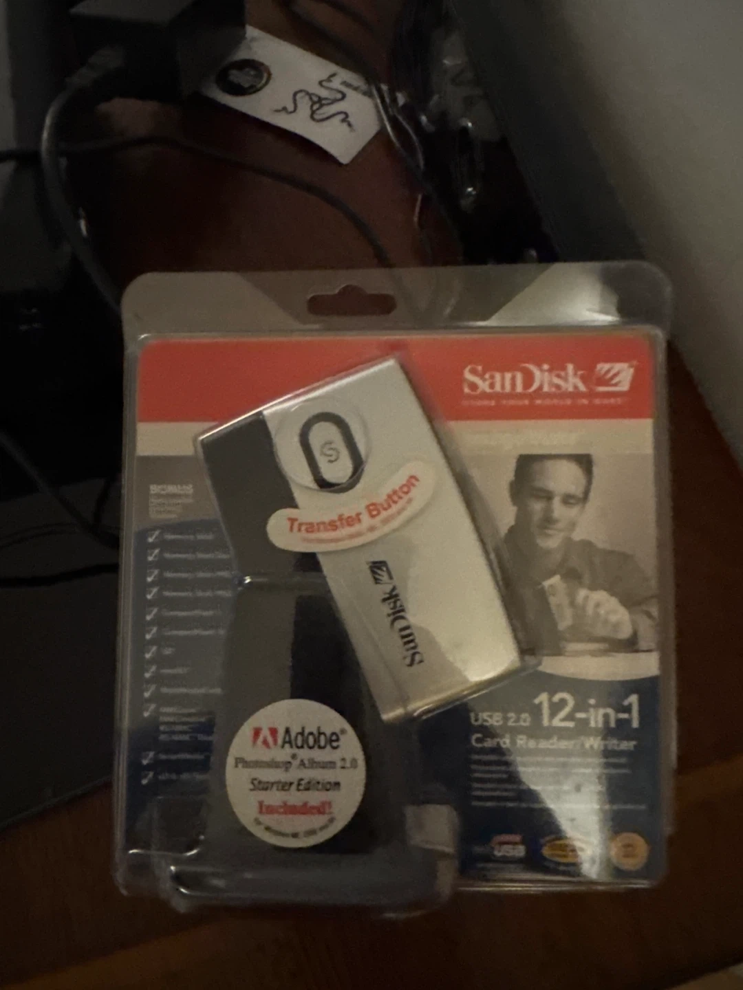 This SanDisk 12-in-1 card reader/writer offers fast and easy transfer between memory card and computer. It's USB 2.0 certified and includes Adobe Photoshop Album 2.0 Starter Edition. Minimum system requirements include a Pentium PC or Macintosh computer with USB support.