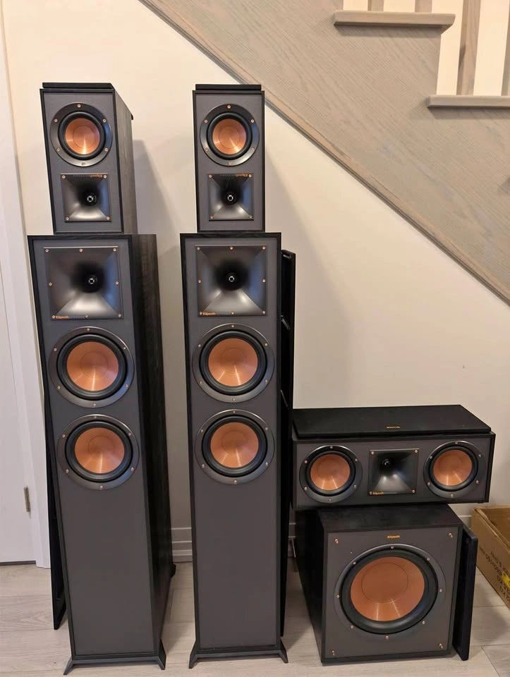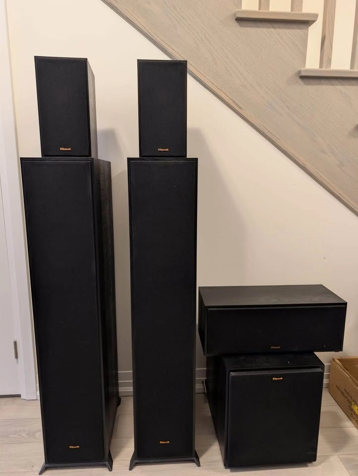 Includes: 2 Klipsch R620F Tower Speakers, 1 Klipsch R52C Centre Speaker, 2 Klipsch R41M Bookshelf Speakers, 1 Klipsch R-100SW Subwoofer, and Sony STR-DH590 5.2 Channel AV Receiver. Also comes with wall mounts and cables. Lightly used and in excellent condition. This is a full home theatre setup offering superior audio quality.