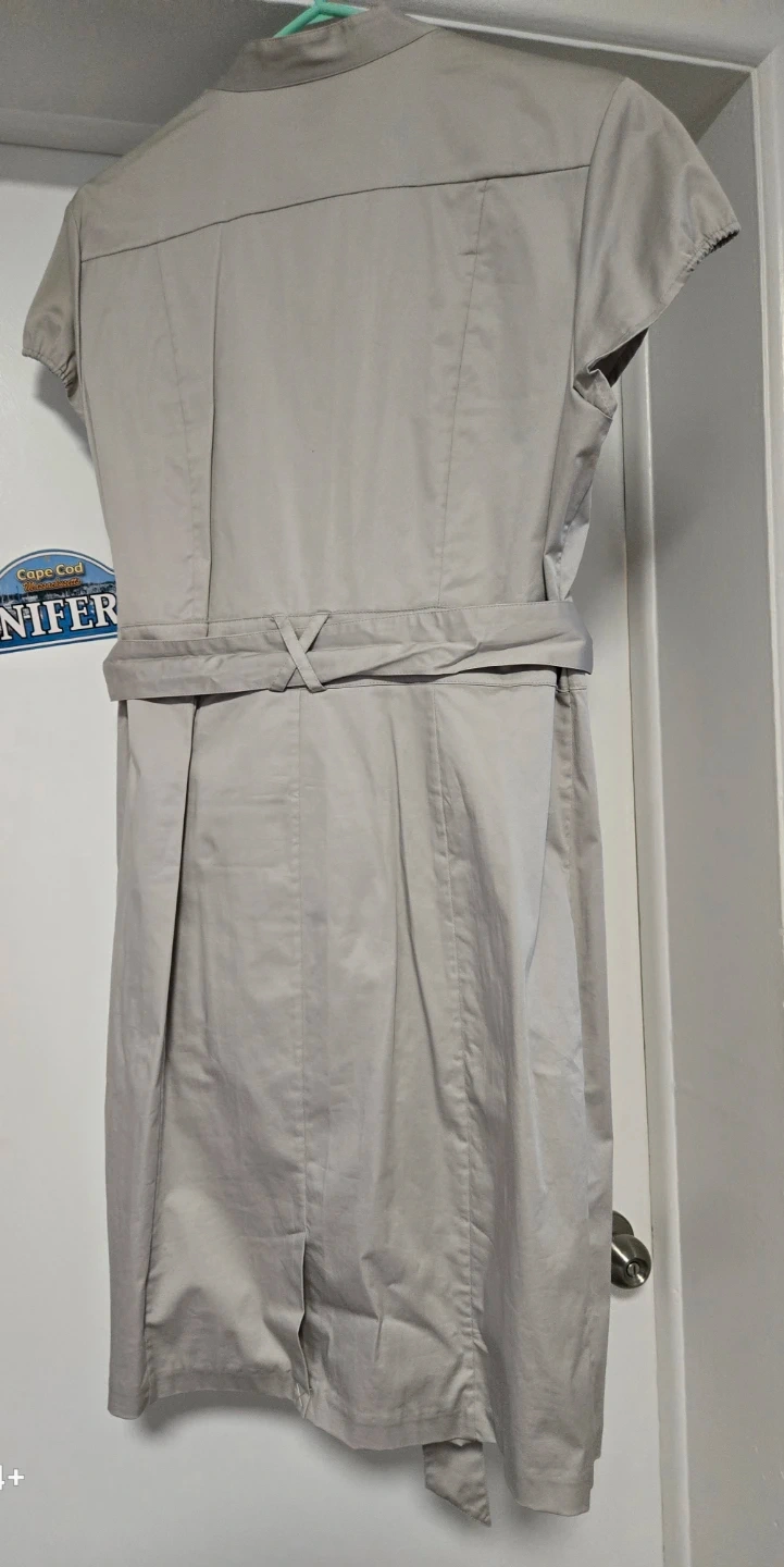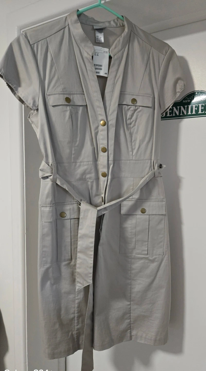 This H&M dress is a stylish beige utility style with a matching belt. It's made with a blend of cotton for comfort. The dress features a button-up front and multiple pockets. It's a size 16, perfect for everyday wear or a casual summer outing. I paid $39.99+tax =$45