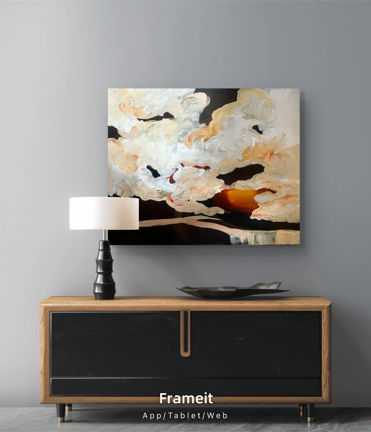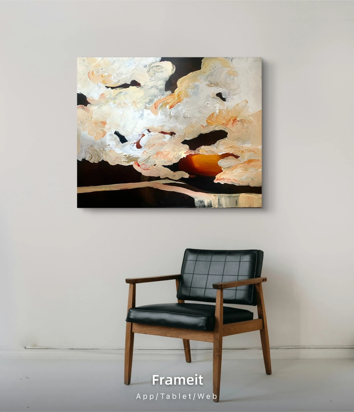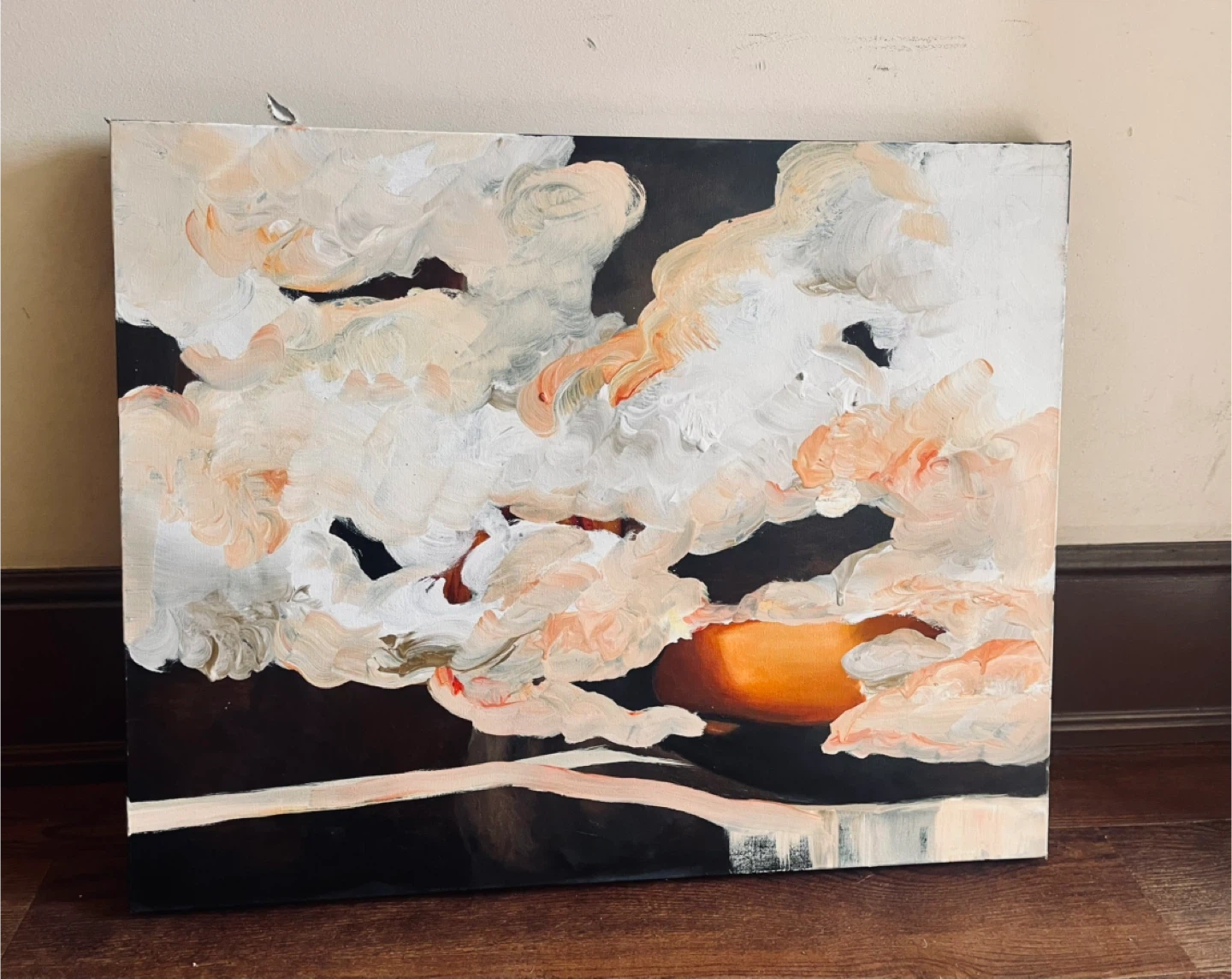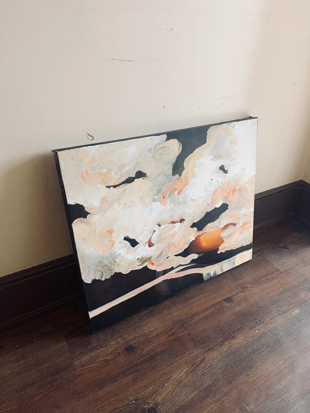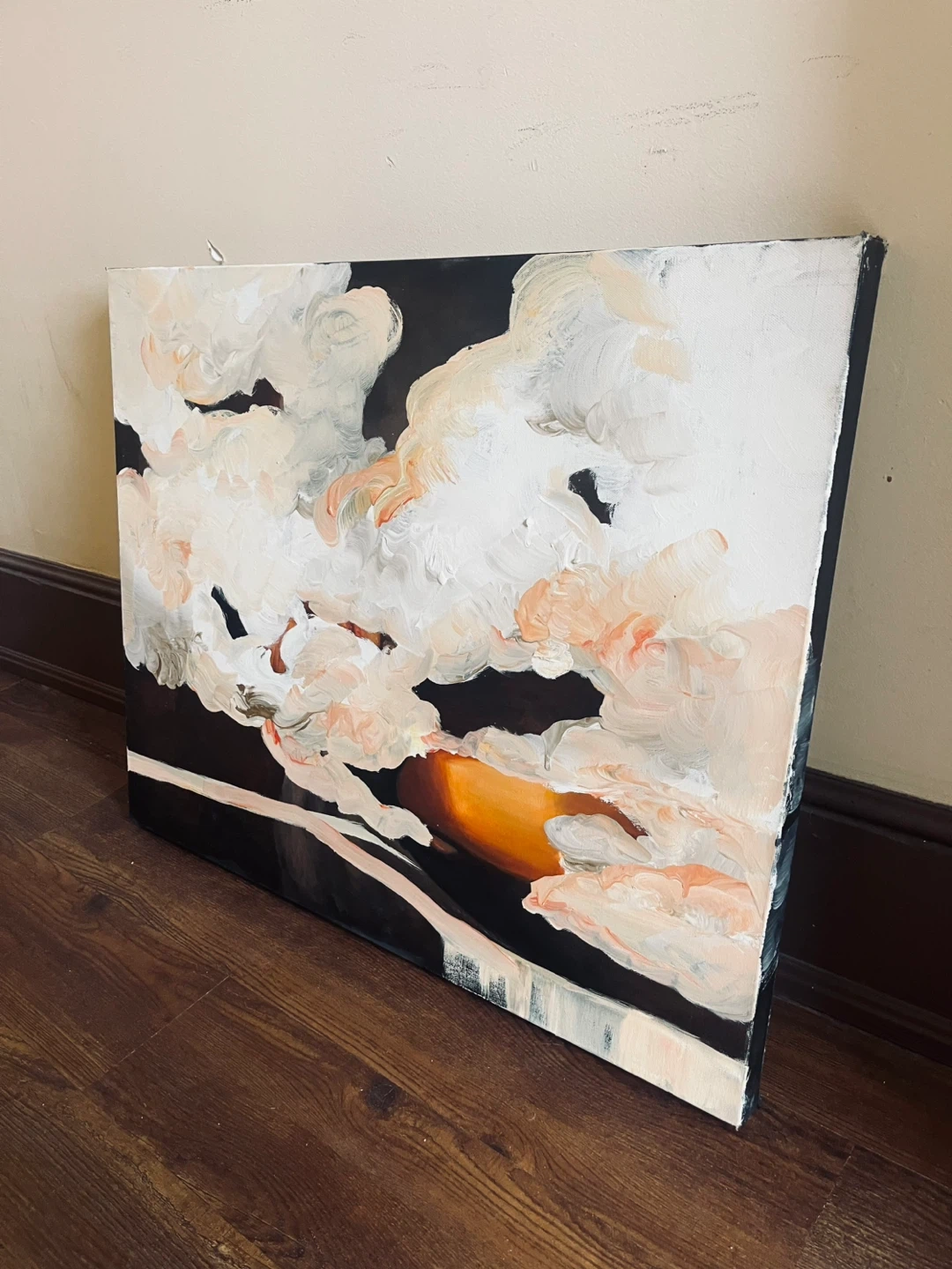Hand painted by local artist on gallery canvas, 24 x 30”. A beautiful abstract oil & pastel painting depicting a cloudscape with sunset hues. The textured brushstrokes create a dynamic visual. It's a canvas piece, ready to add a unique touch to any room.