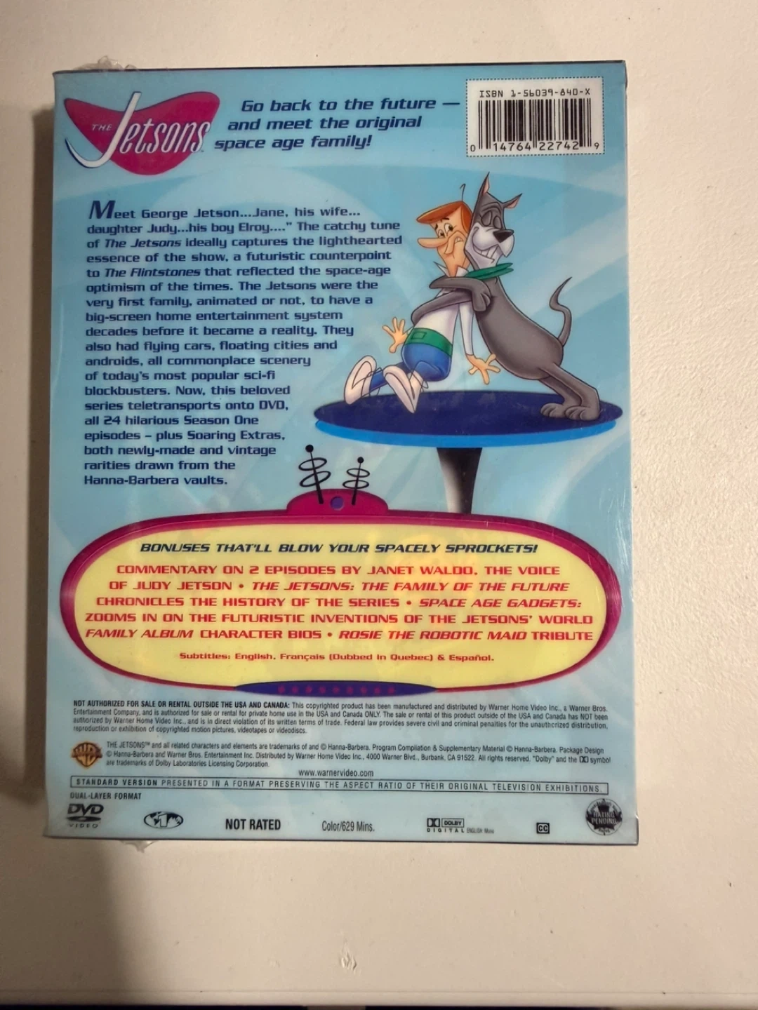 The Jetsons: The Complete First Season DVD collection. Includes all 24 episodes of season one and bonus extras. Subtitles are in English, Français (dubbed in Quebec) and Español.