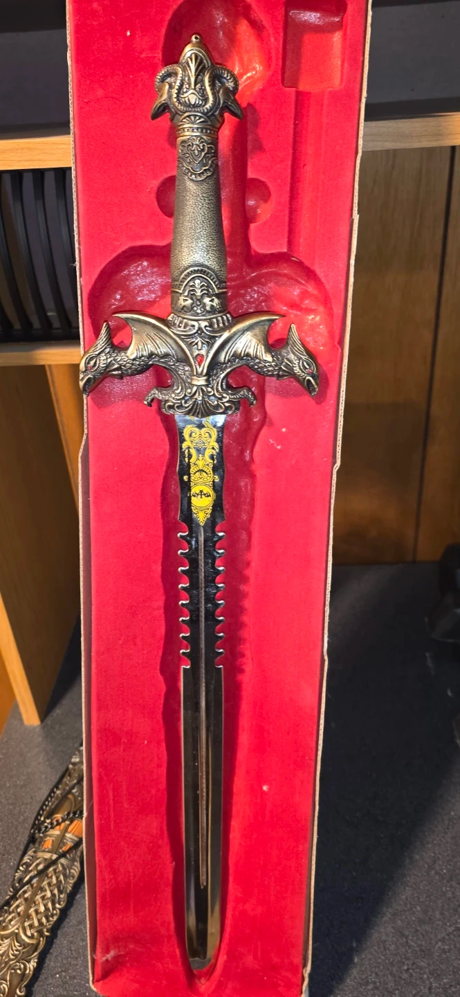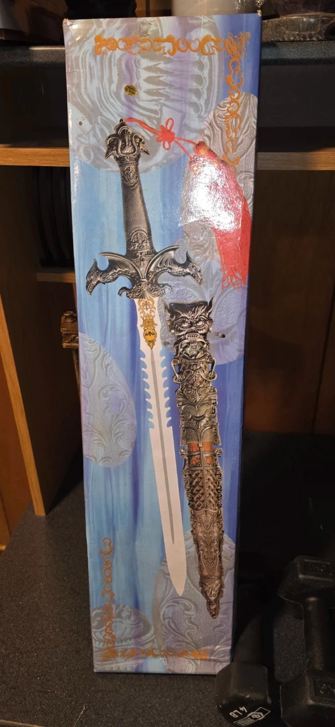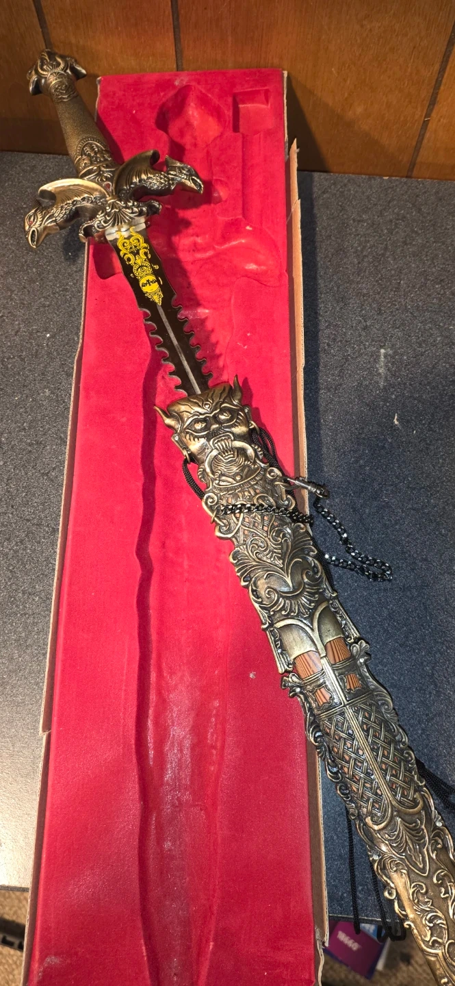 This decorative sword features an ornate, dragon-themed scabbard and hilt. It's designed for display and includes a matching scabbard. The metallic finish has intricate detailing throughout. It's a unique piece for collectors or display enthusiasts!