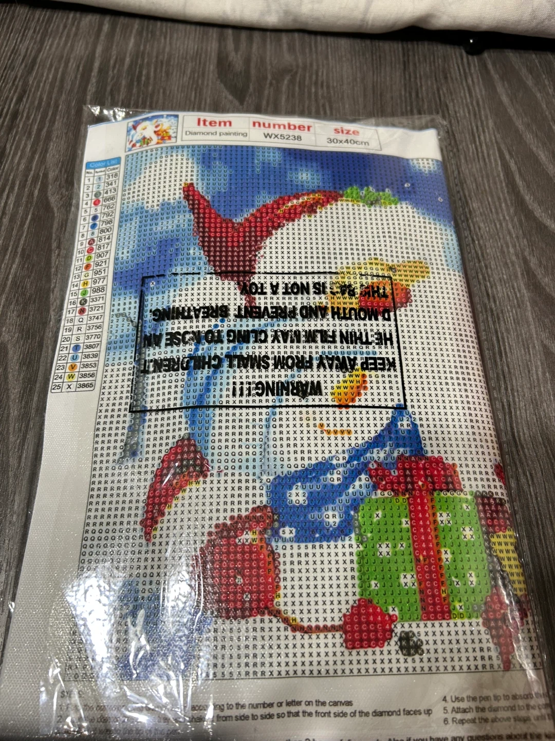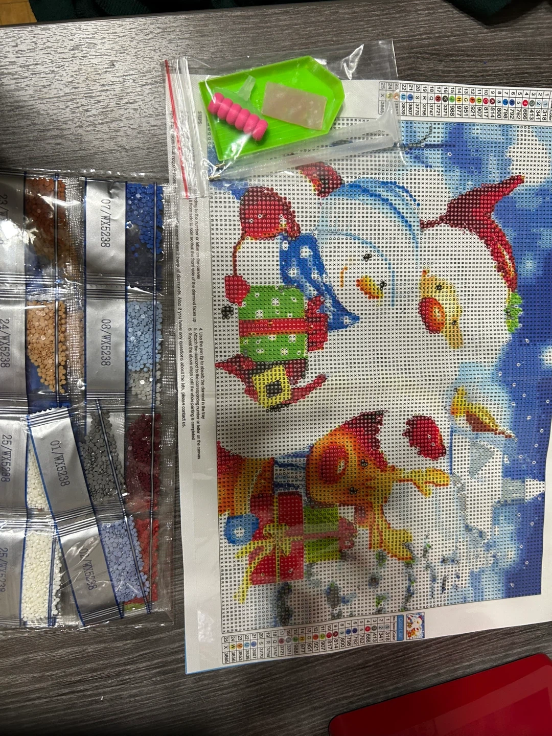 New Unopened diamond painting kit featuring a snowman and a dog. Includes canvas, beads, and tools. Size 30x40cm. Perfect for a cozy winter craft project!