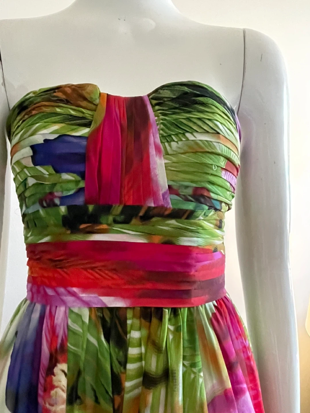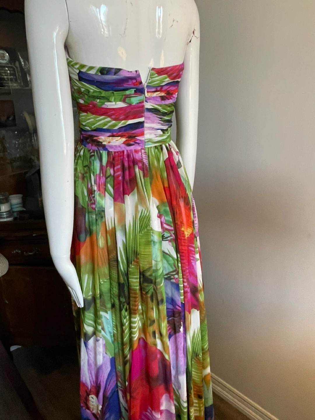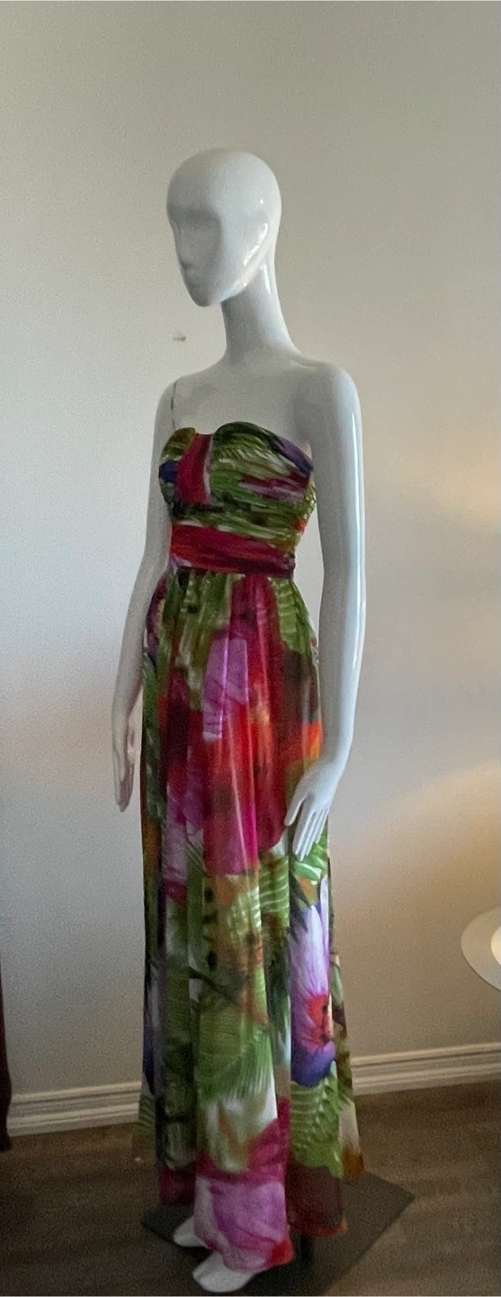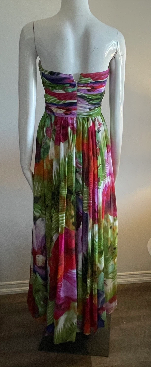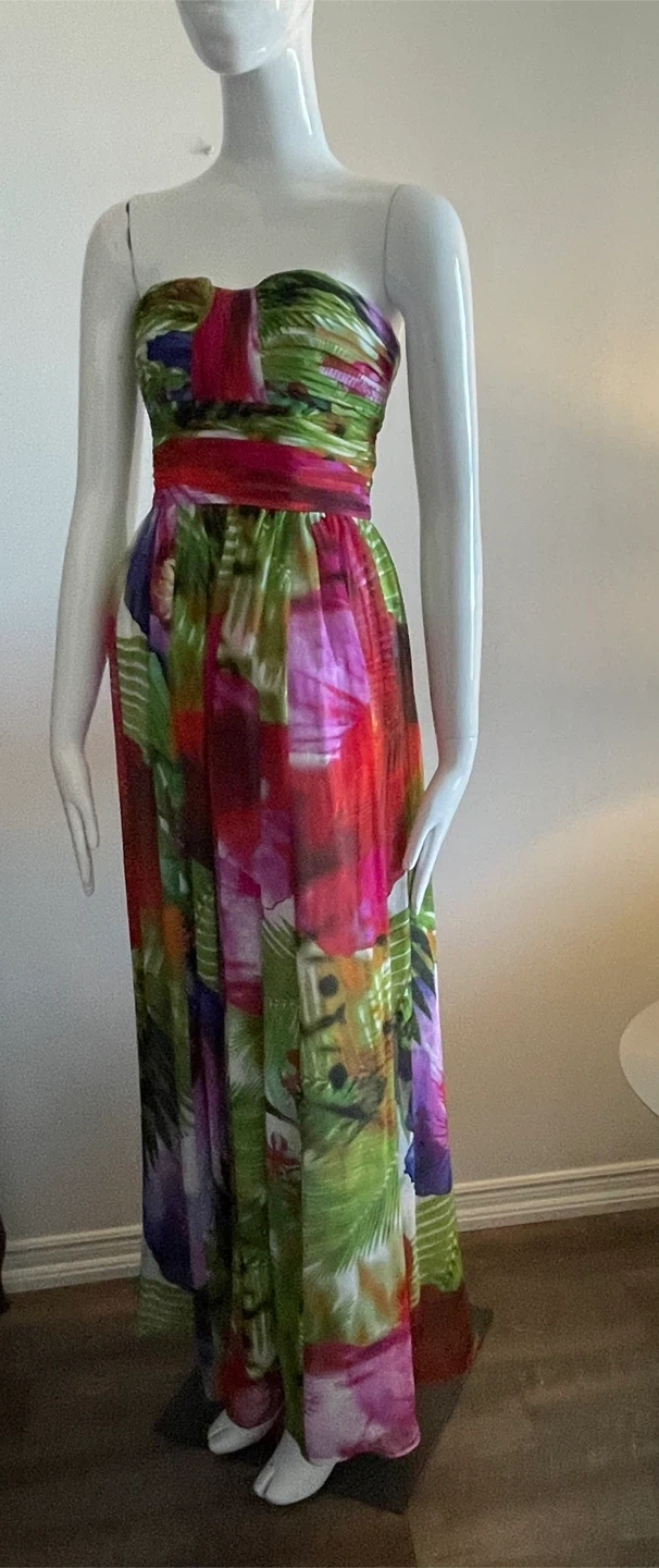 Vibrant floral print strapless maxi dress. It features a ruched bodice and a flowing skirt. Perfect for a special occasion!