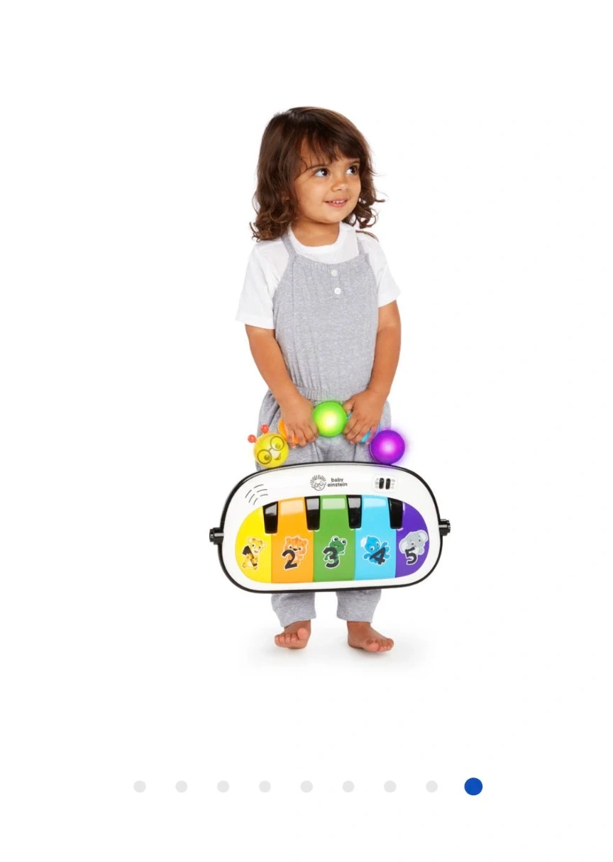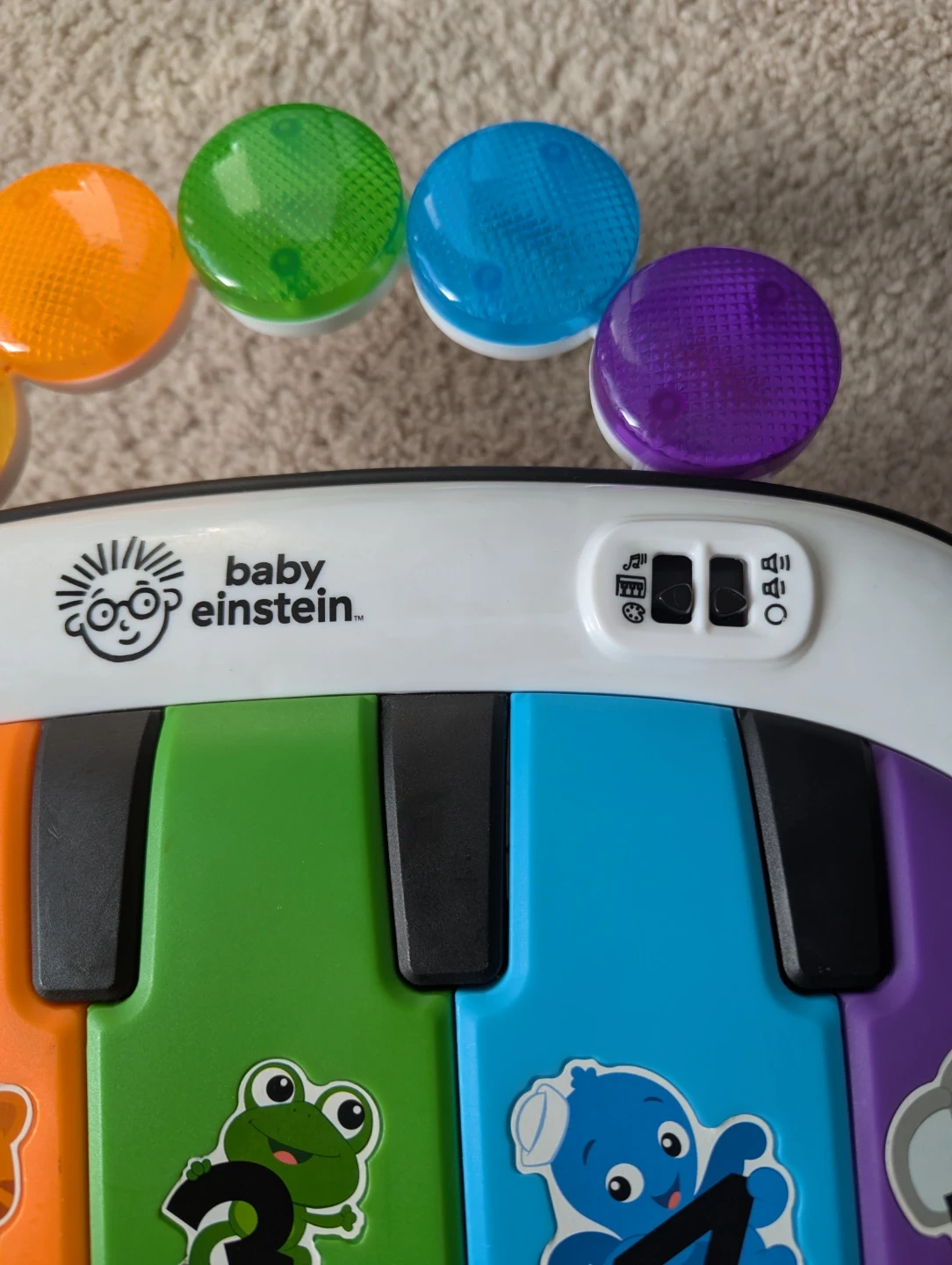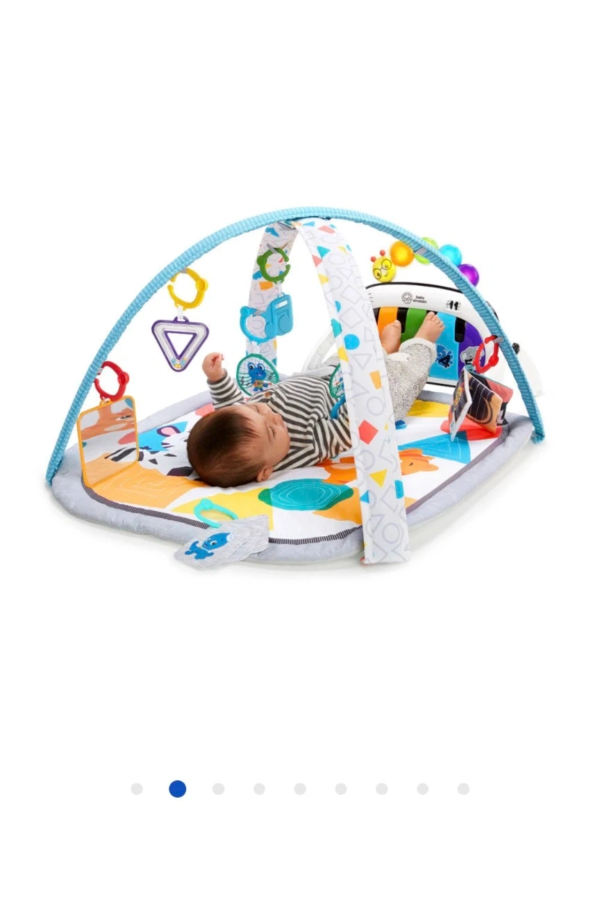 This Baby Einstein musical piano features colourful keys with animal graphics. It has lights and sounds to entertain little ones. Perfect for tummy time and play.