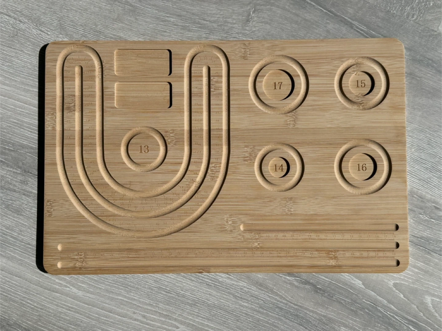 This bamboo rolling tray features U-shaped grooves and circular indentations with numbers. It also includes etched measurement markings along the edge. Made from durable bamboo.