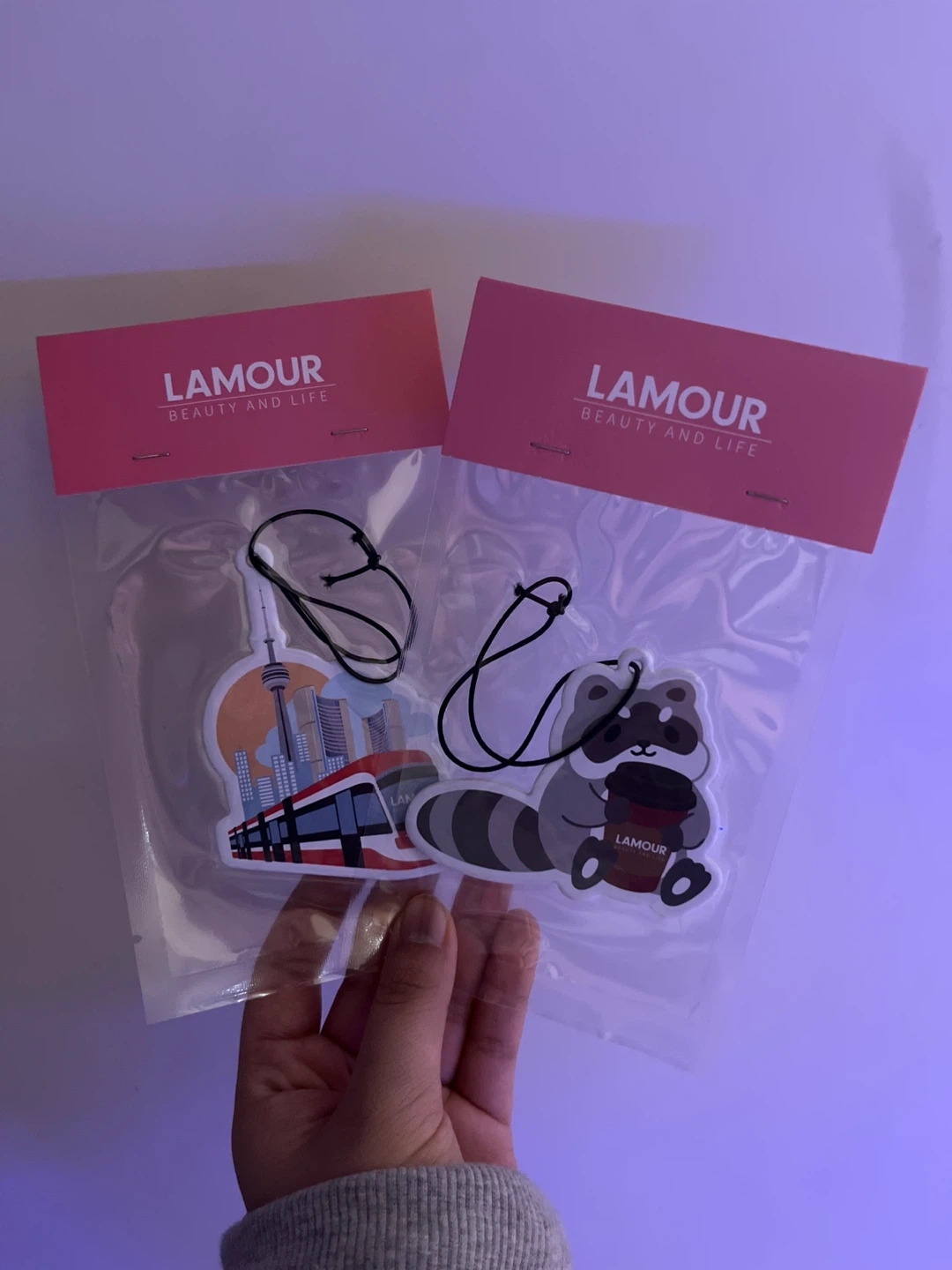 This is a set of two L'amour car air fresheners. One features a Toronto skyline design, and the other has a cute raccoon drinking coffee. Both have a jasmine fragrance. They're great for freshening up your vehicle!