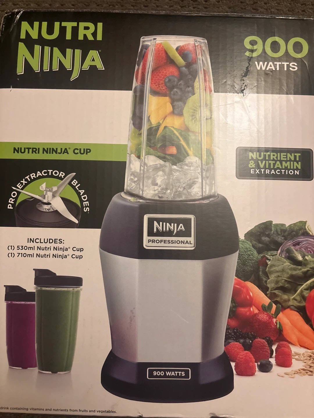 Nutri Ninja Professional blender with 900 watts of power. Includes one 530ml cup and one 710ml cup. Features Pro Extractor Blades for nutrient and vitamin extraction.