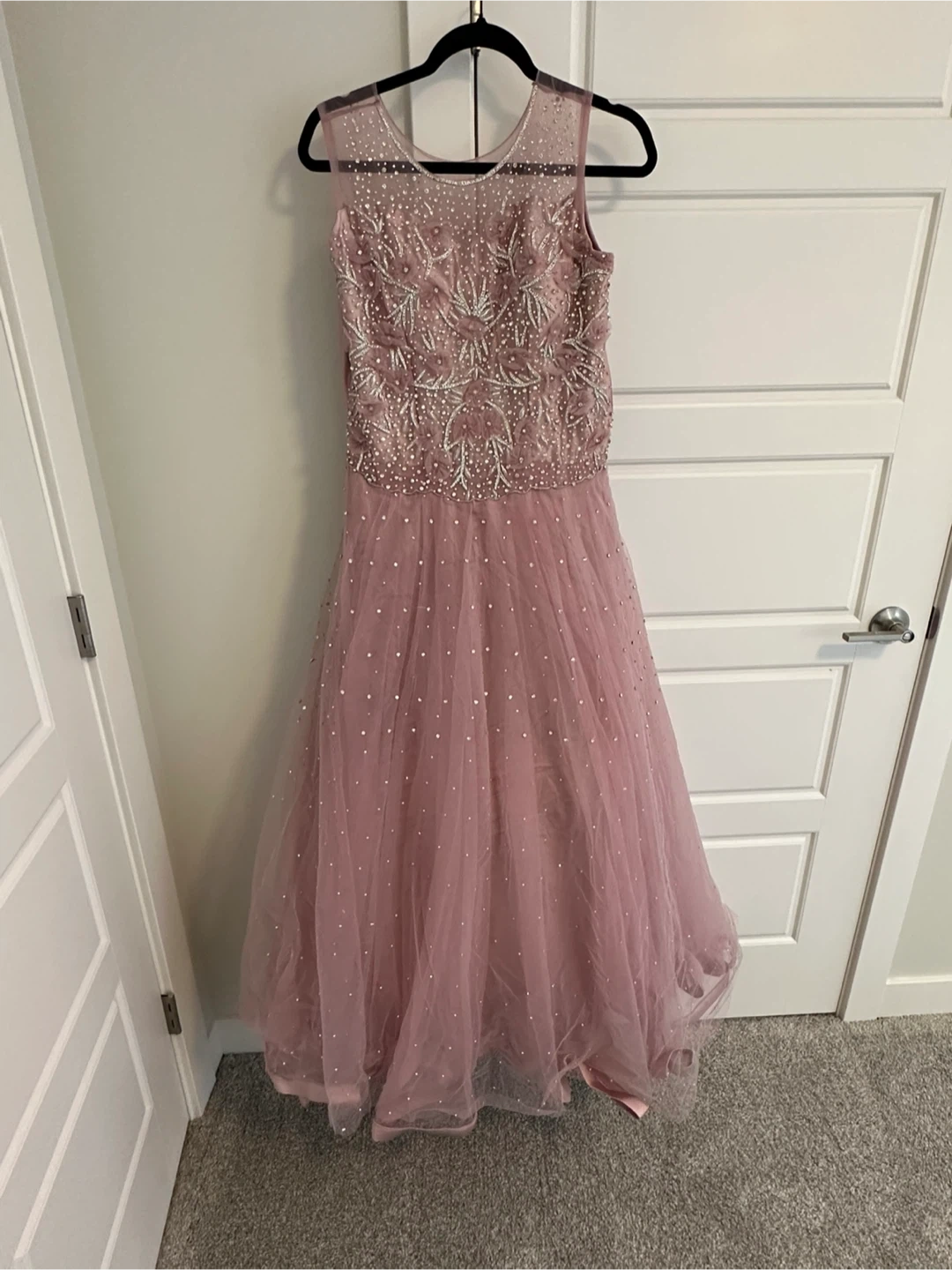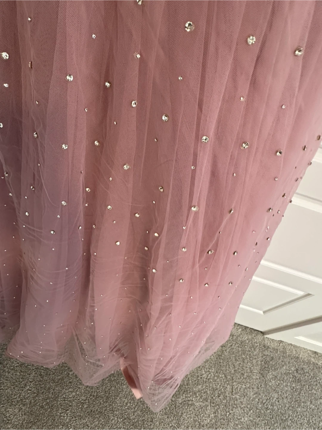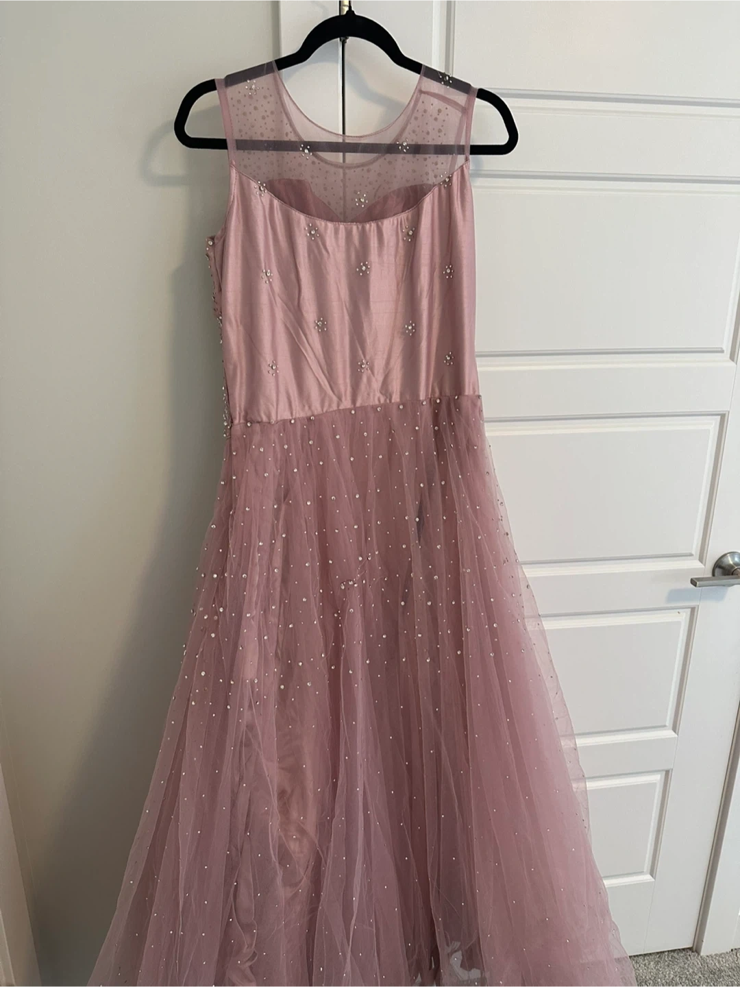 Beautiful pink formal gown with intricate beadwork and floral embellishments on the bodice and scattered on the tulle skirt. Sleeveless with a sheer neckline. Perfect for special occasions!