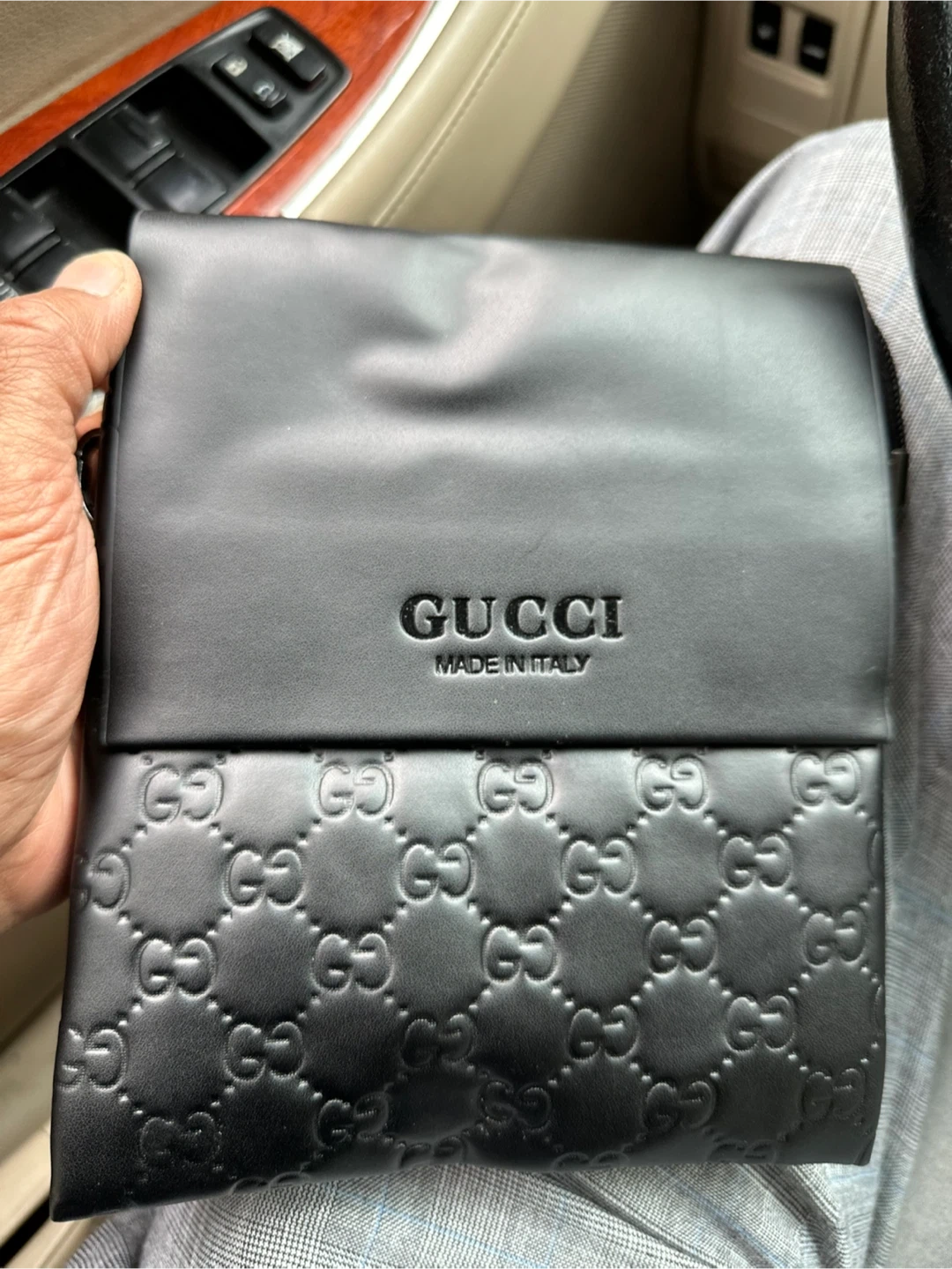 Selling a stylish Gucci clutch in black leather. Features the iconic Gucci logo and 'Made in Italy' marking. The clutch has a distinctive embossed pattern. Perfect for carrying essentials in style!