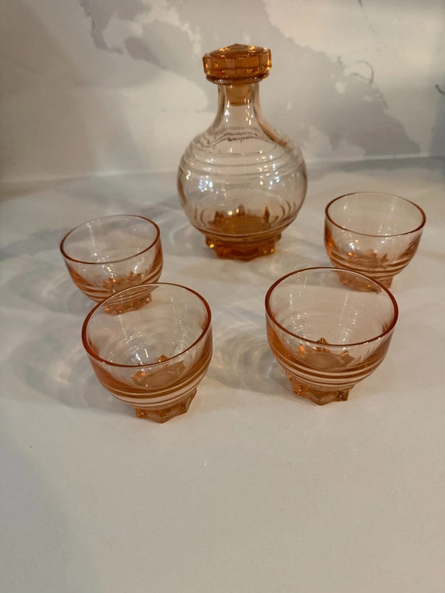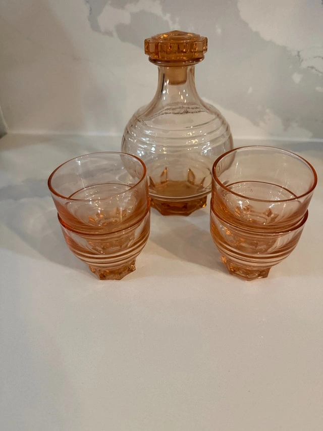 French Art deco from the 50's. Decanter with stopper and four shot glasses. Made of molded pink glass, often referred to as "Rosaline" glass or "peach" glass. Excellent condition - no cracks or nicks. Refer to pictures. Cash accepted.
