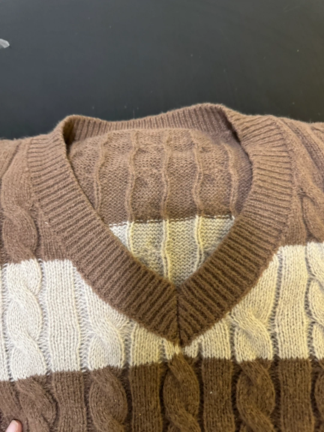 Cozy V-neck sweater with alternating brown and cream stripes. Features a classic cable knit pattern throughout. Perfect for adding a touch of warmth and style to your outfit!