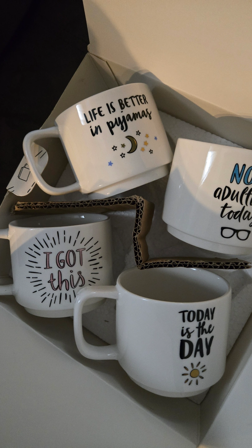 Brighten up your mornings with this charming set of four Indigo mugs, each adorned with unique and whimsical sayings to add a touch of fun to your coffee or tea routine! This set is in like new condition, and ready to find a new home.