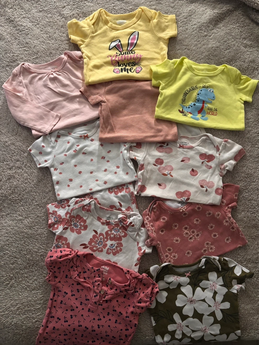 Seven adorable Carter's baby girls' bodysuits, perfect for everyday wear. Includes a mix of short-sleeve and long-sleeve styles with various cute prints like bunnies, dinosaurs, florals, and cherries. Made from soft cotton for baby's comfort. All the T shirts are Sizes 24 months.