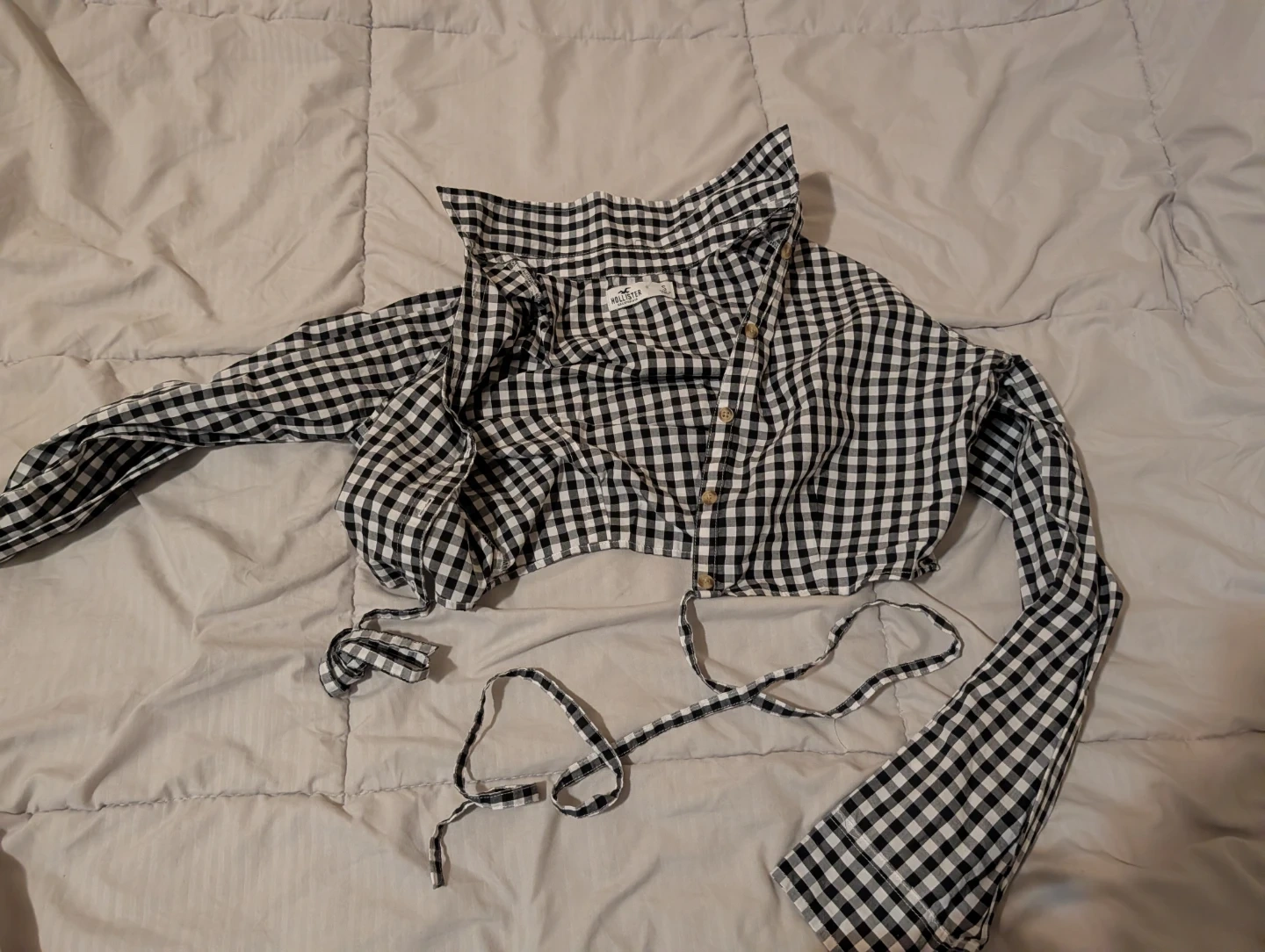 This Hollister crop shirt features a black and white gingham pattern. It's a size small with long sleeves and a tie detail at the hem. Button-up front.