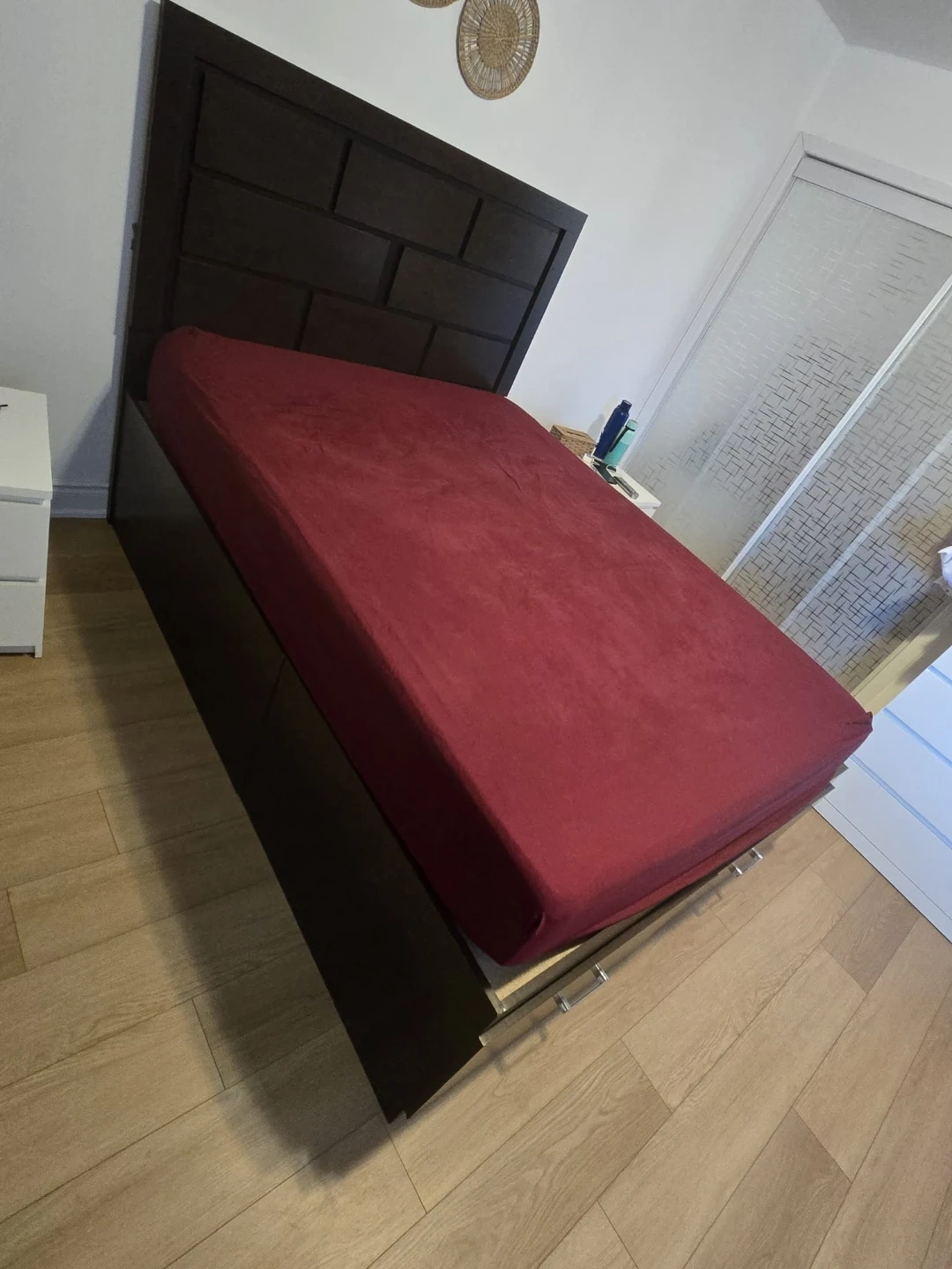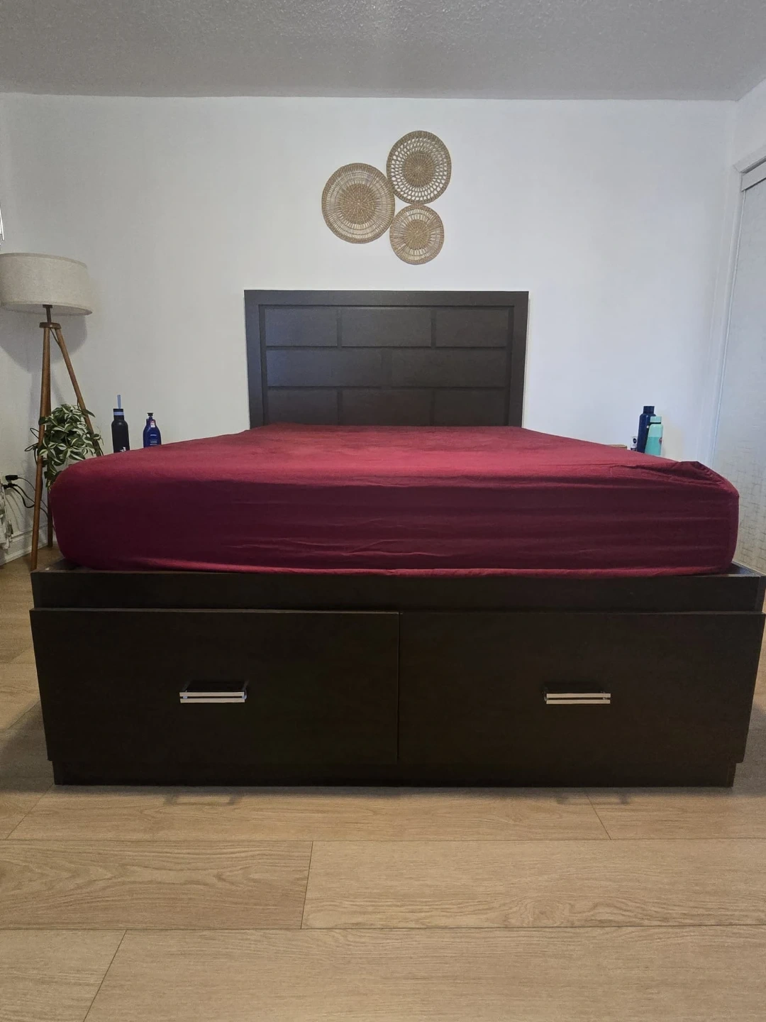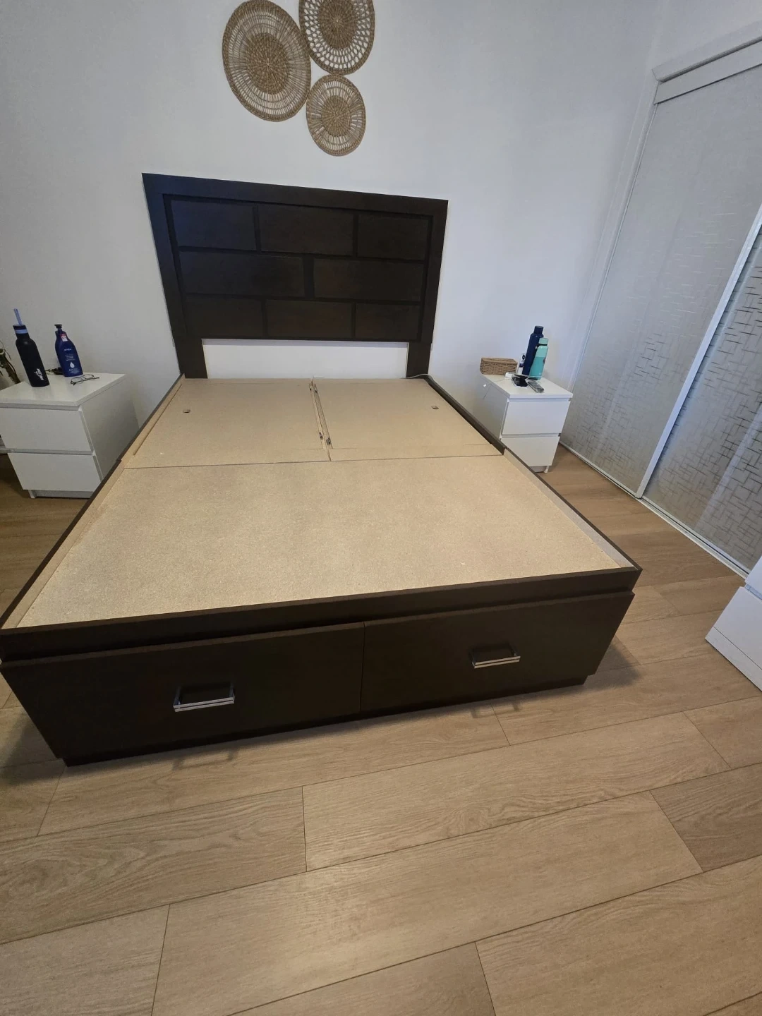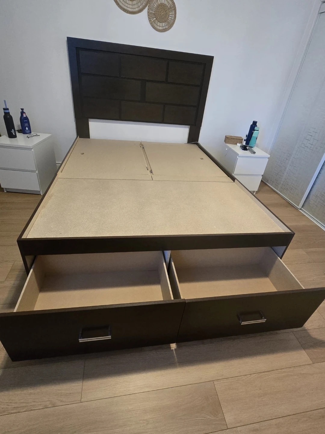 Queen size bed frame with headboard in a dark brown finish. It features a modern headboard with horizontal paneling and two large drawers at the foot of the bed. There's also hidden storage space accessible from the top. This bed's great for keeping your room tidy!