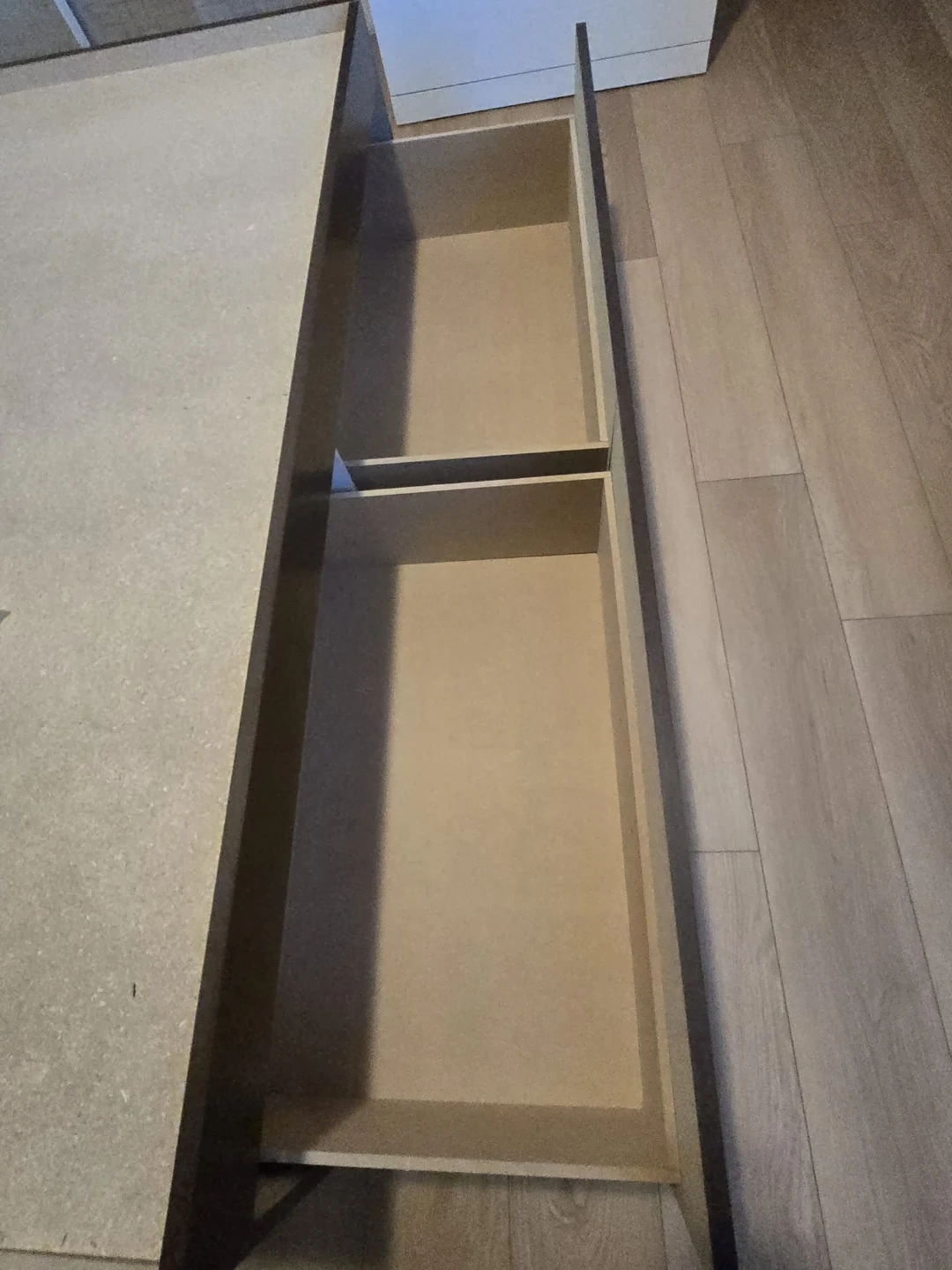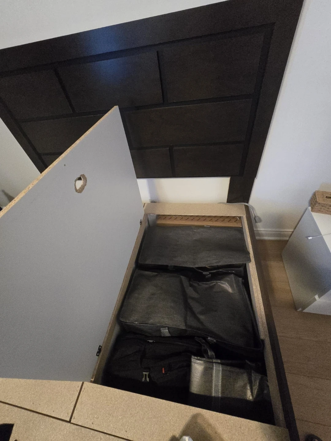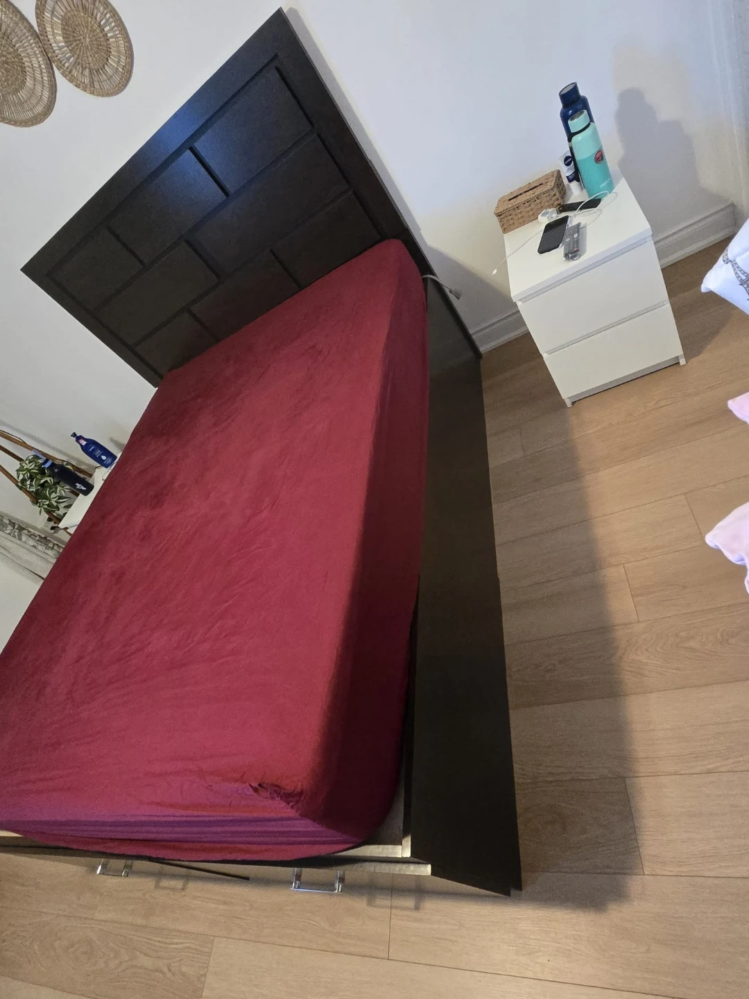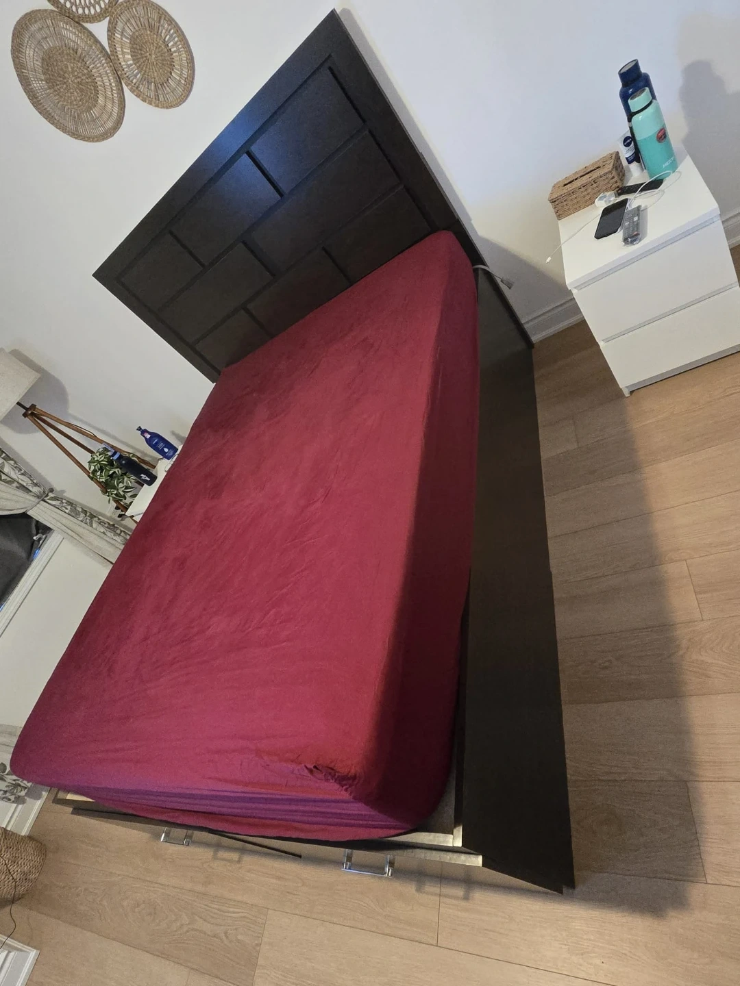 Queen size bed frame with headboard in a dark brown finish. It features a modern headboard with horizontal paneling and two large drawers at the foot of the bed. There's also hidden storage space accessible from the top. This bed's great for keeping your room tidy!