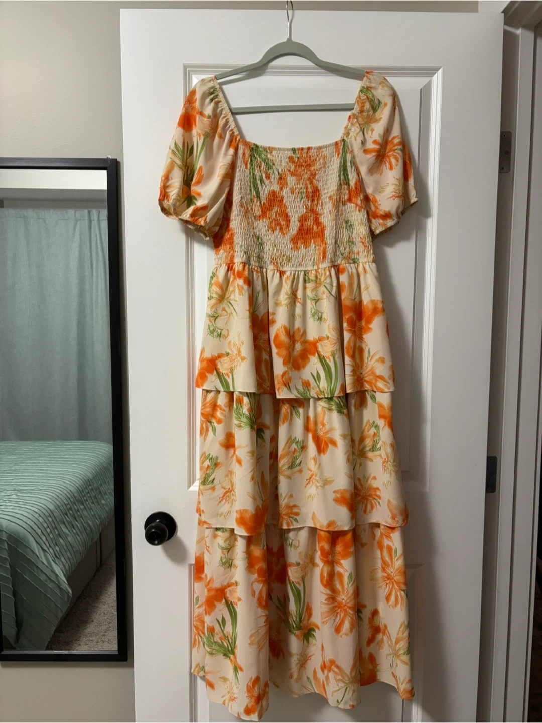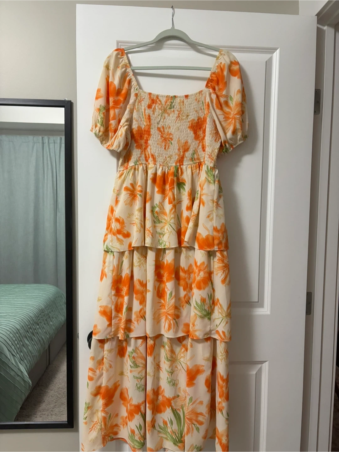 Selling a lovely BTFBM floral tiered maxi dress. It's a size large and features a beautiful orange and cream floral pattern. Perfect for a sunny day out or a special occasion