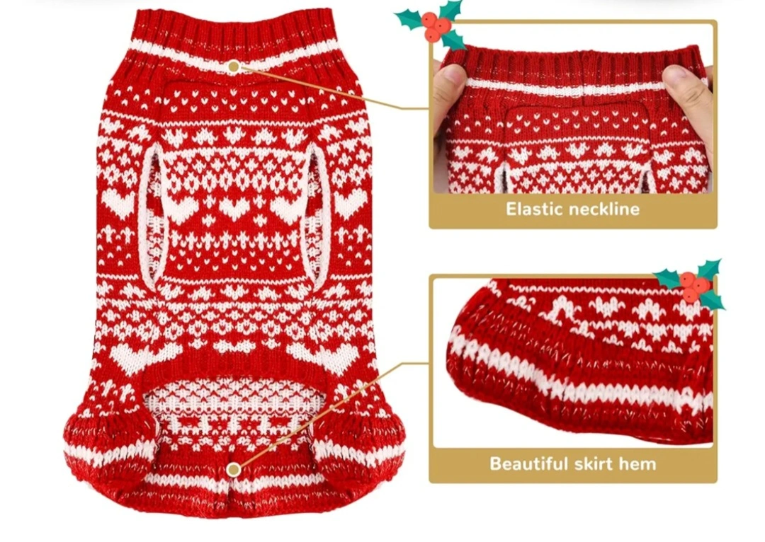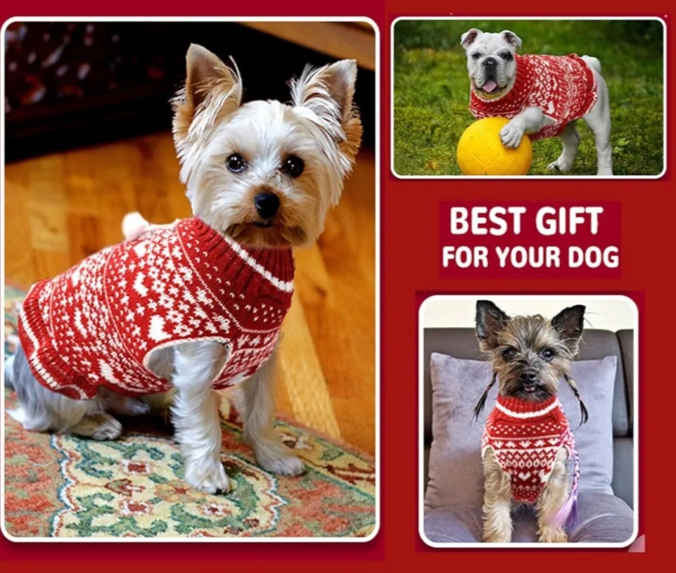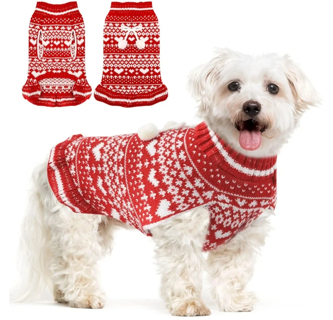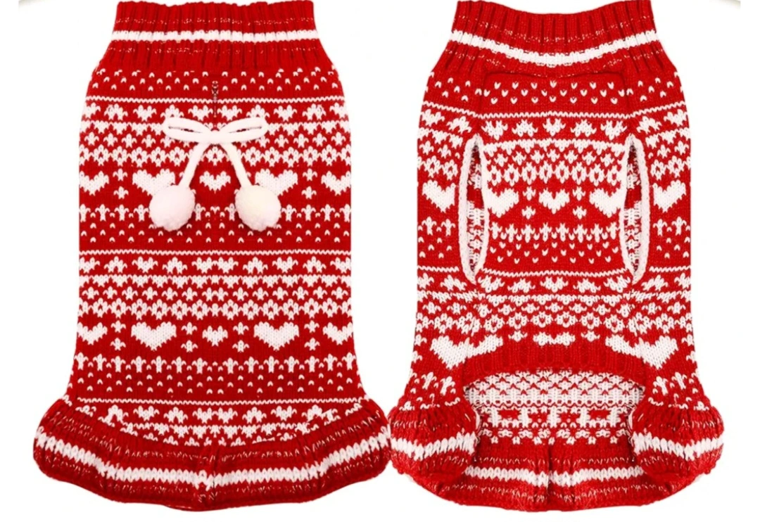 Dog sweaters. Red and white knit material. Features a festive heart pattern. Perfect for the holiday season.