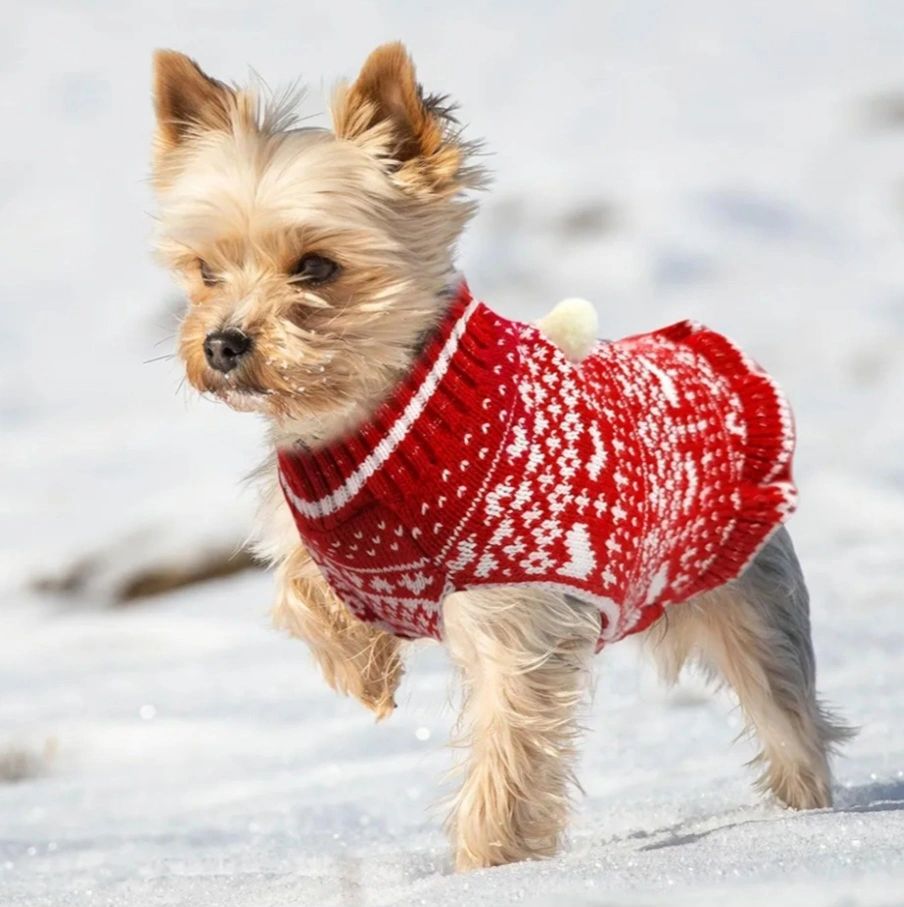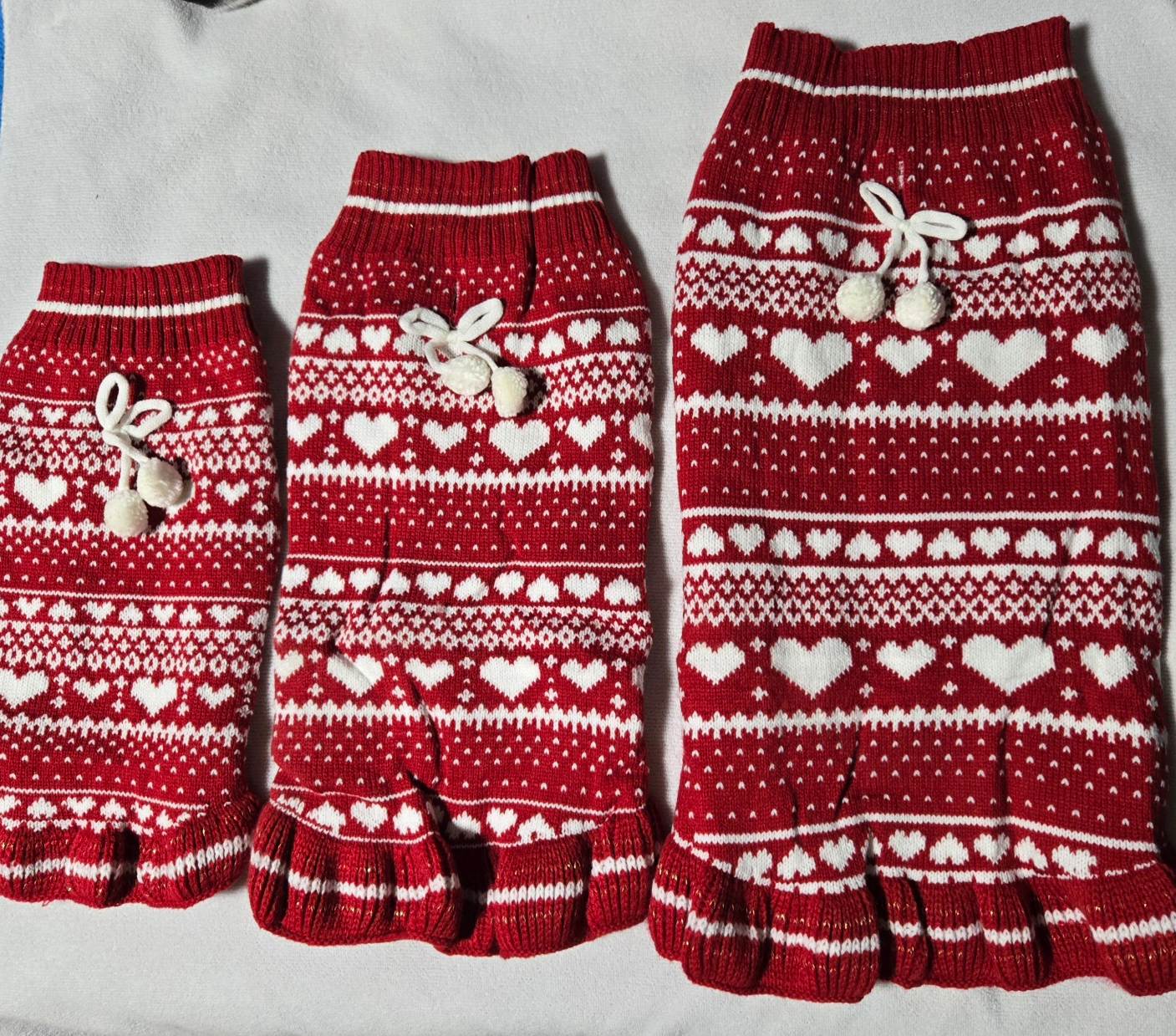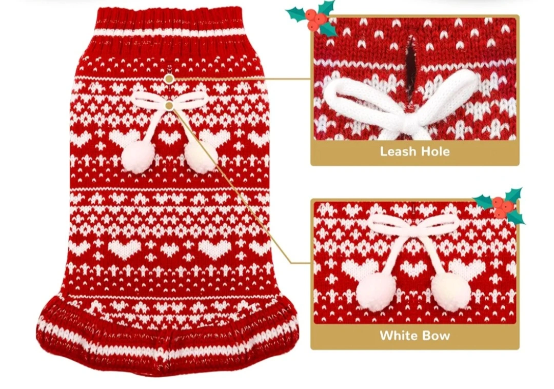 Dog sweaters. Red and white knit material. Features a festive heart pattern. Perfect for the holiday season.