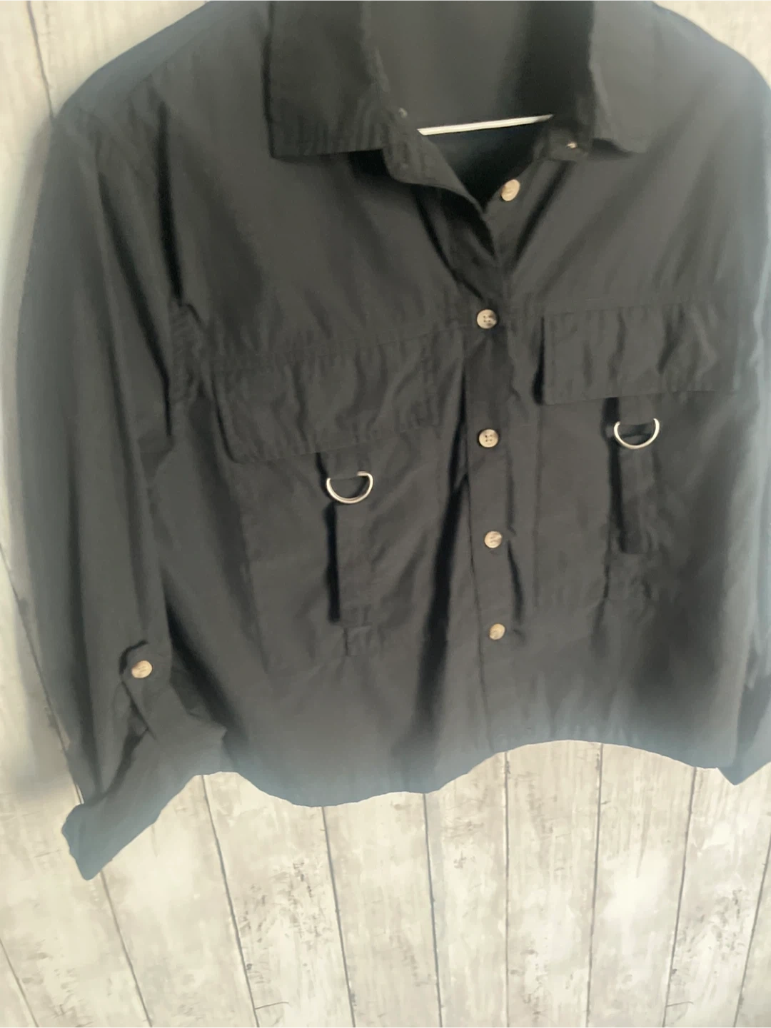 This is a black button-up crop shirt. It features two chest pockets with D-ring details. The material is cotton blend. Size Medium