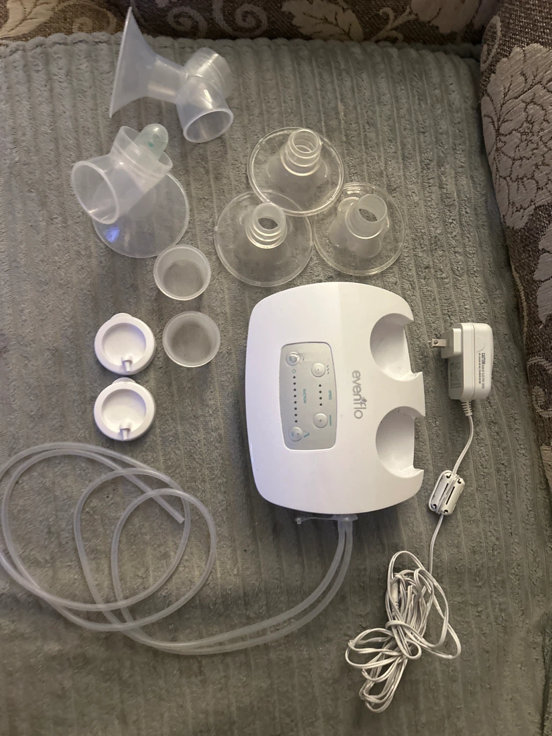 This Evenflo electric breast pump comes with all the parts shown. It includes the pump motor, tubing, flanges, and power adapter. It's designed for efficient milk expression.