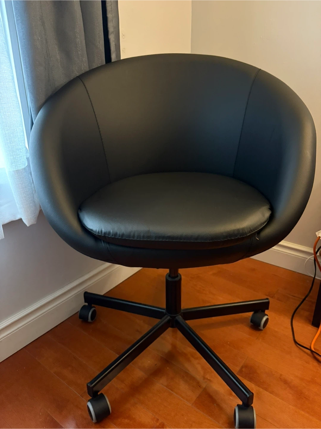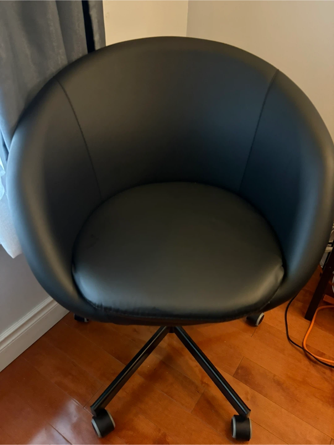 Stylish black accent chair with a modern design. It features a comfortable upholstered seat and a swivel base with wheels for easy mobility. The chair's unique shape makes it a great addition to any room.