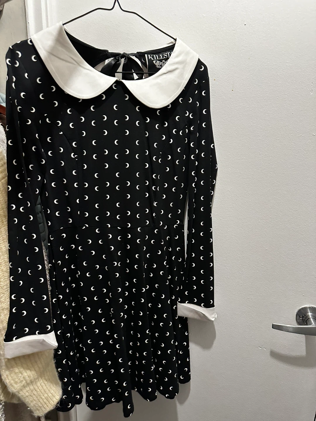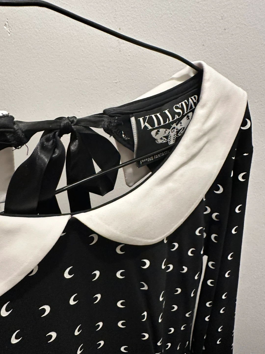 Selling a KILLSTAR Moon Child dress. It's black with a white collar and a moon pattern. It has a ribbon tie at the back.