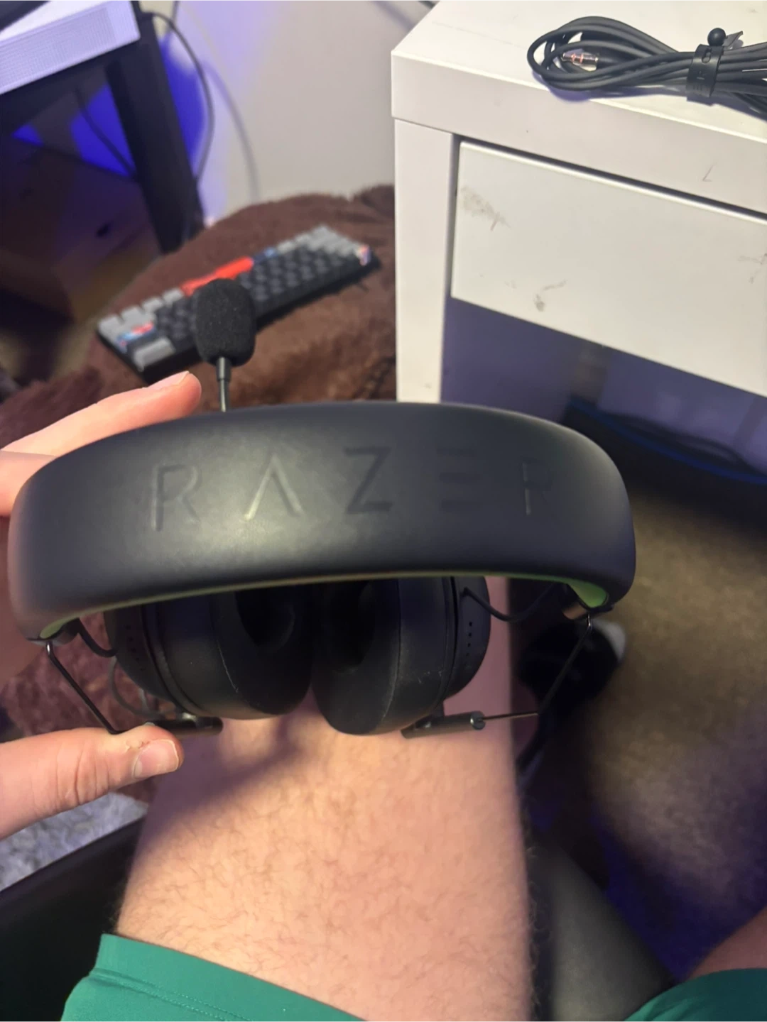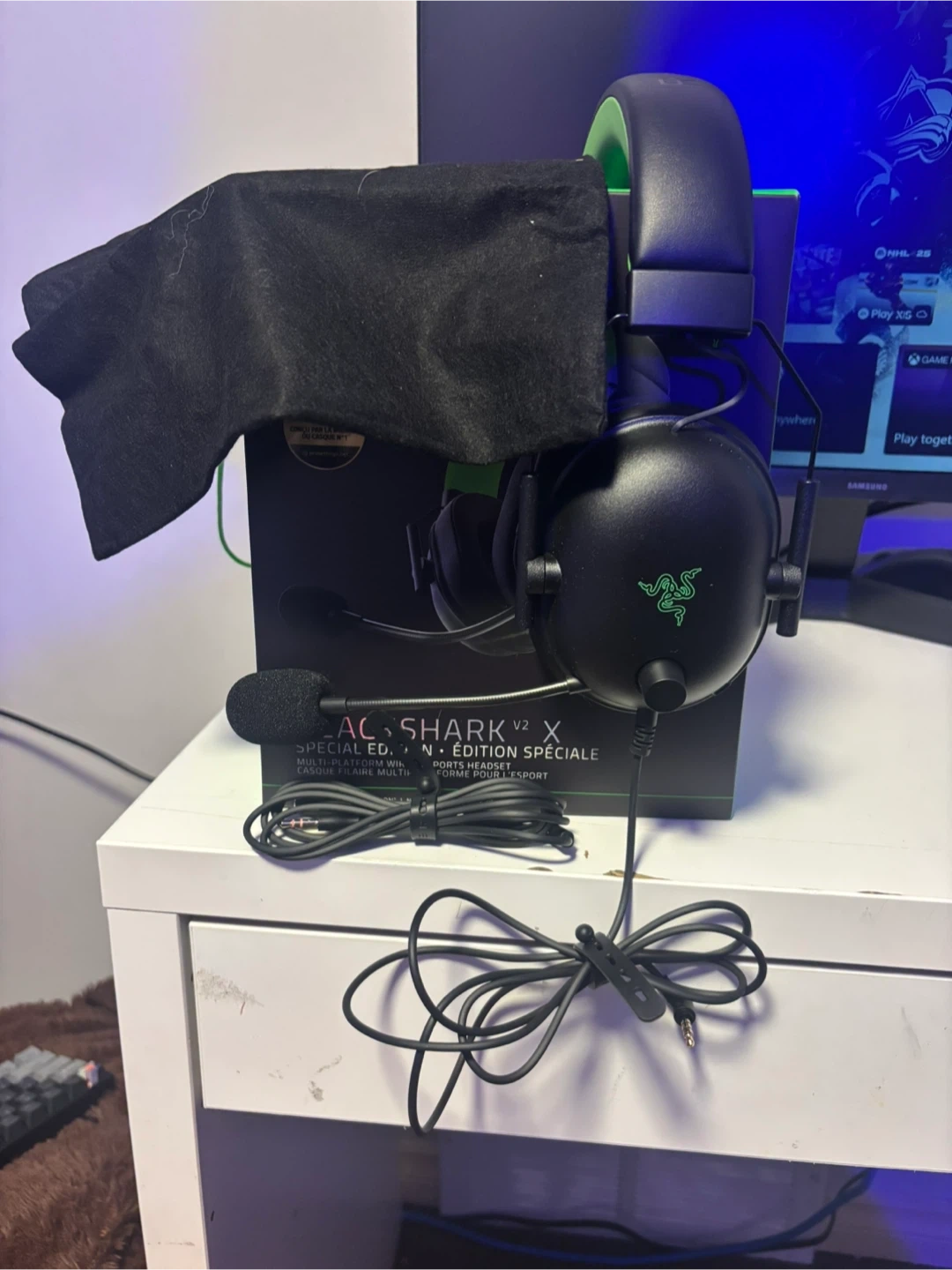 This is a Razer Black Shark V2 X Special Edition gaming headset. It's designed for comfort with plush ear cushions. The microphone is detachable. Perfect for gamers who need clear communication.