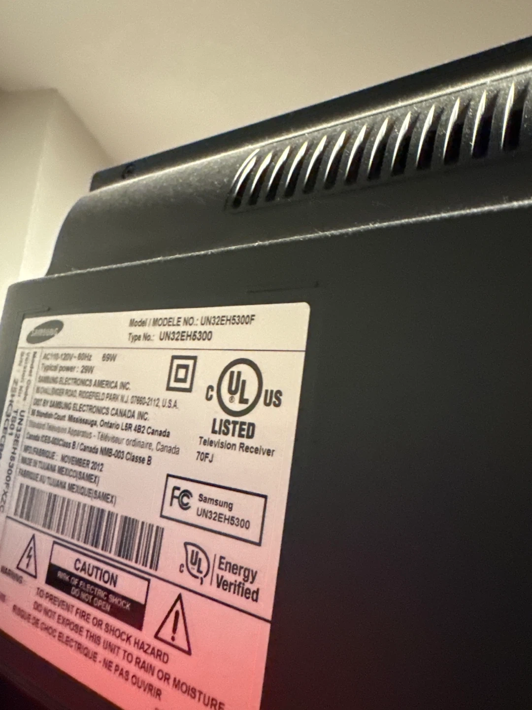 Samsung 21.5 inch LED television. Model UN32EH5300F. Made in November 2012. Energy Verified. It's a great TV for a bedroom or smaller space!