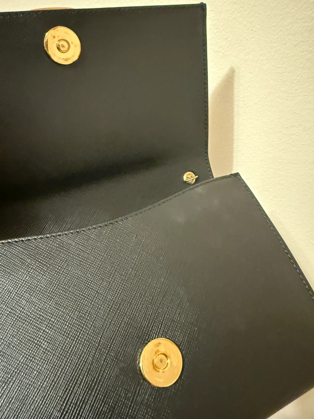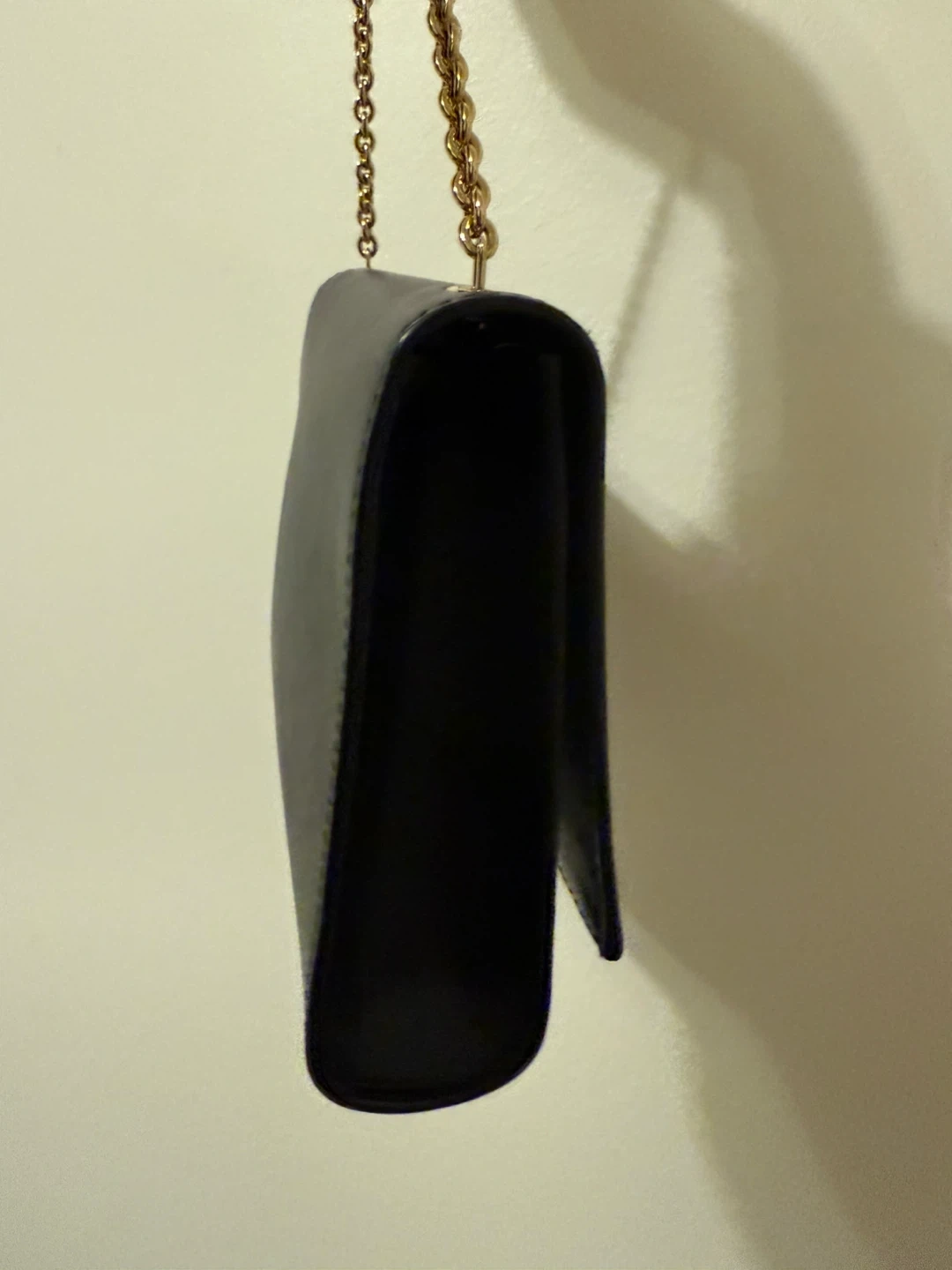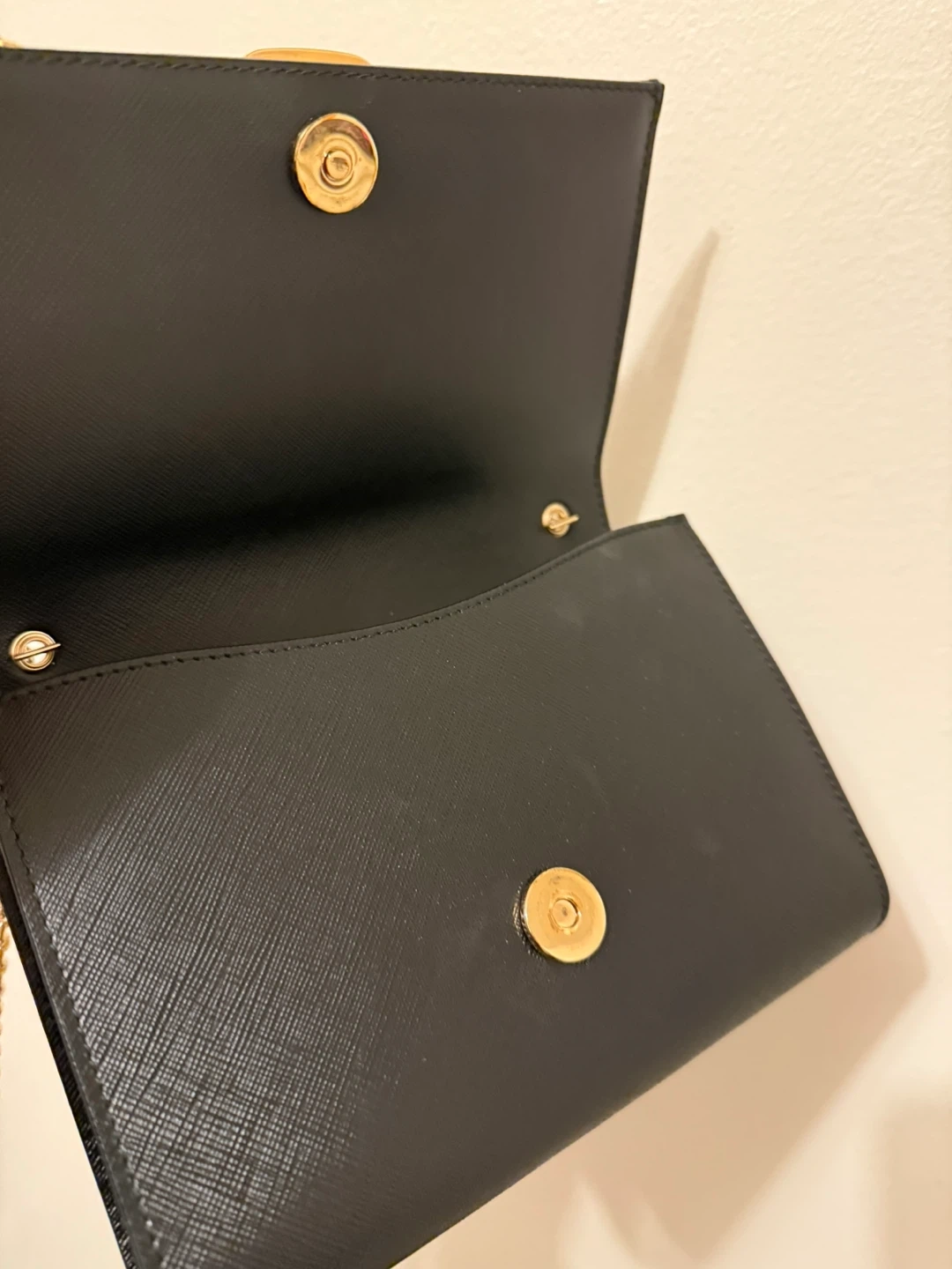 Beautiful black leather wallet on chain by Salvatore Ferragamo. It features their iconic Gancini clasp with gold hardware. It's compact yet practical for essentials.